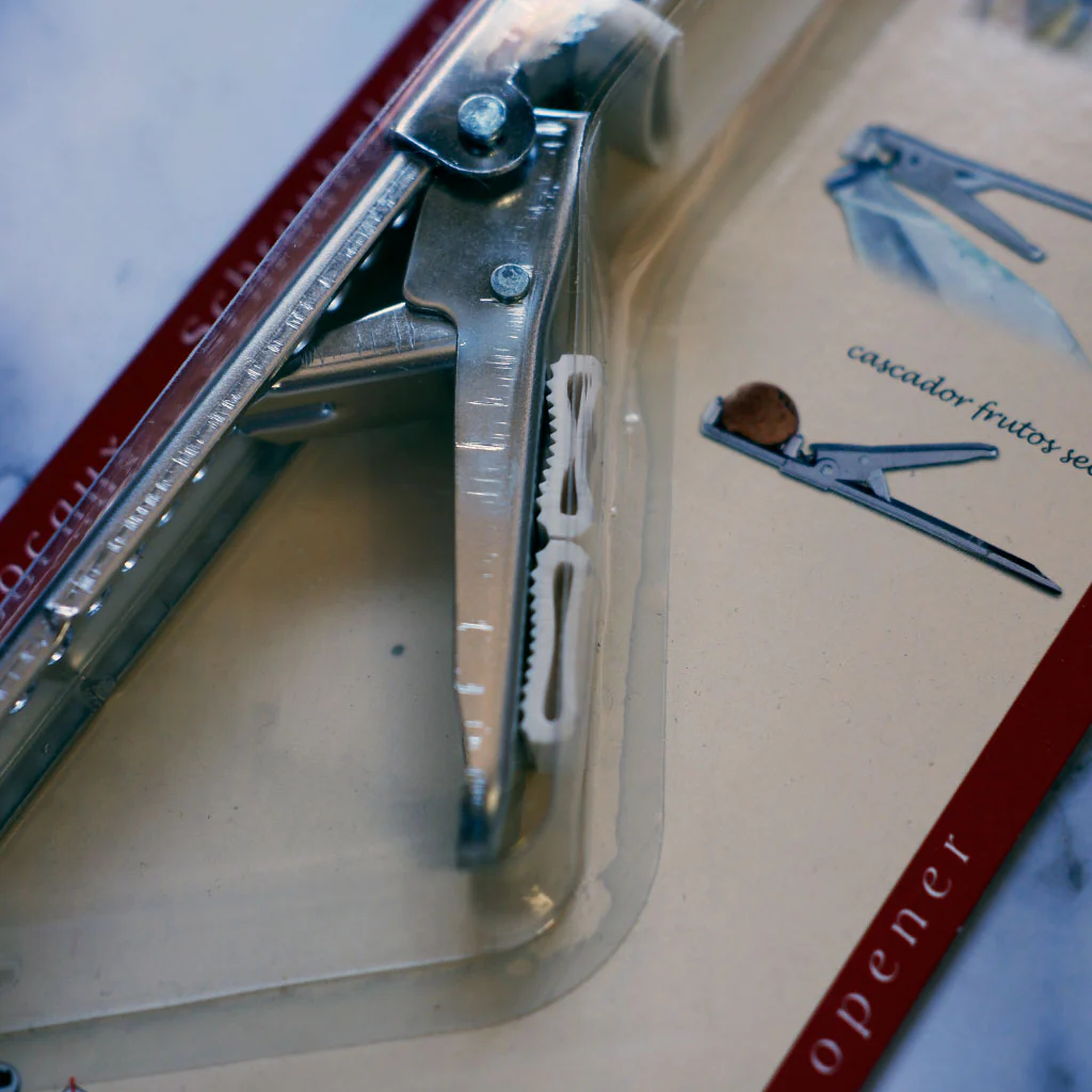 Las gomas en los extremos de la apertura permiten que el abridor se fije bien a la tapa o sujete sin resbalar el fruto seco a partir. Incluye dos gomas de repuesto y está fabricado en España.