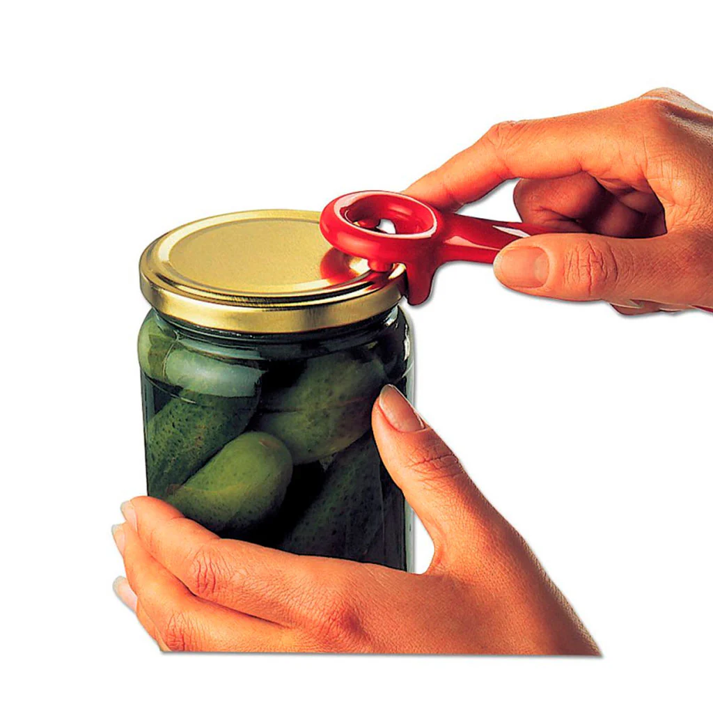 Sólo tienes que colocar el abridor en el límite de la tapa del bote que vas abrir, y con un efecto palanca tirar hacia arriba, de forma que entrará aire en el envase, perderá el vacío y podrás abrir sin problema. ¡Sin uso de cuchillos ni puntas, de la forma más segura y en un segundo!