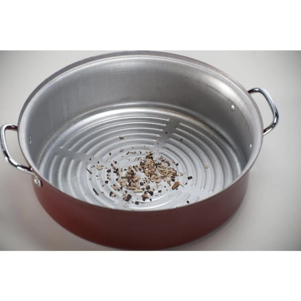 Para usarlo pondremos un par de cucharadas de astillas de madera para ahumar (puedes encontrar astillas de distintos tipos de madera aquí) en el recipiente y luego la bandeja para líquidos encima. Podemos cocinar sin añadir ningún líquido a la bandeja o añadiendo un vaso de agua en la bandeja. Cocinar con algún líquido nos permitirá obtener carnes más tiernas e incluso añadir sabor si usamos cerveza o añadimos algún zumo o vino al agua.