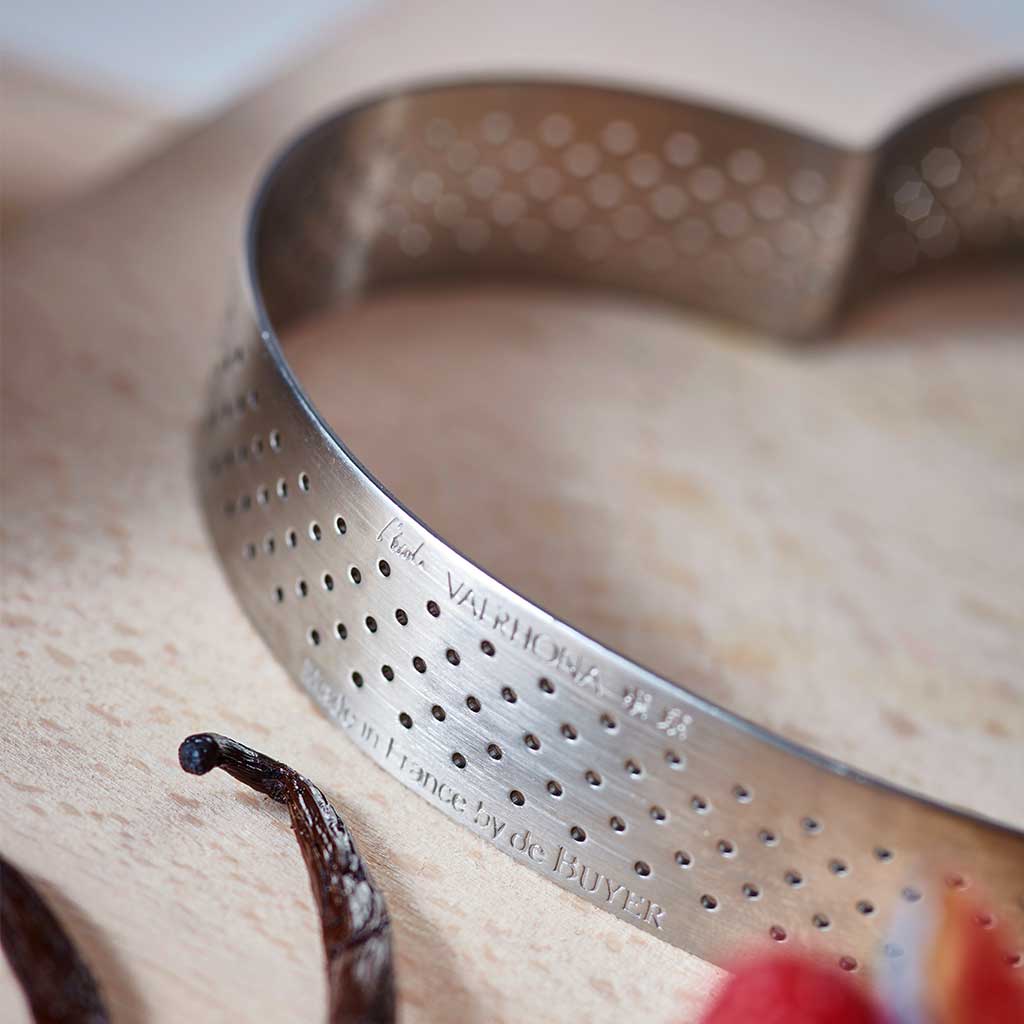 - El modelo perforado ha sido desarrollado en colaboración con la Ecole du Grand Chocolat Valrhona, y es perfecto para el horneado de la masa quebrada, sablee, hojaldre o de empanada. Proporciona en menos tiempo un resultado crujiente y homogéneo.