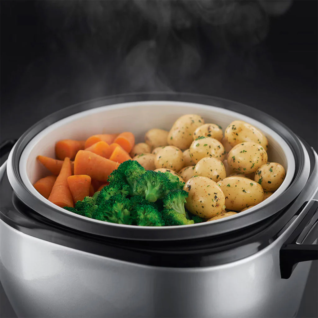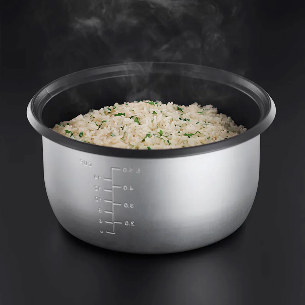 La magia comienza con su diseño práctico: incluye una espátula y un vaso medidor para que puedas medir y servir fácilmente. Además, viene con un recipiente adicional para cocinar al vapor, ideal para preparar verduras y acompañamientos saludables mientras cocinas el arroz.