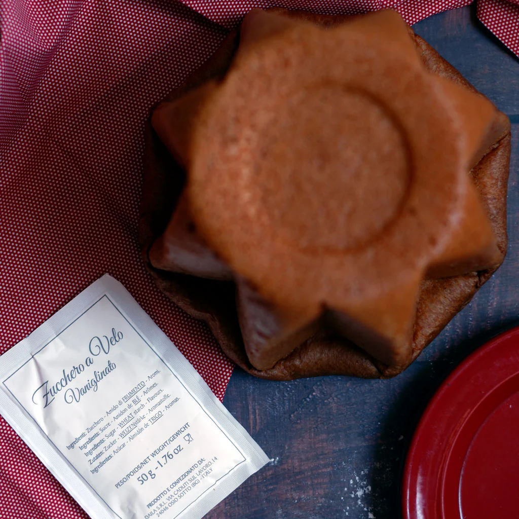 - El paquete contiene un sobre de 50 g de azúcar glasé, para poder espolvorear el pandoro con el azúcar justo antes de llevarlo a la mesa.