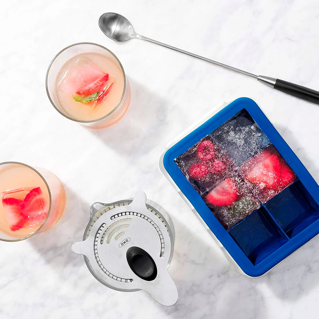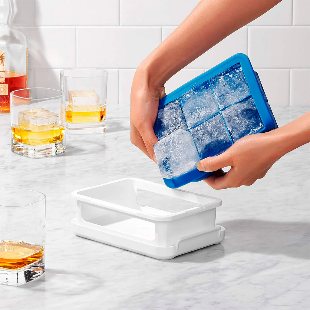 La Bandeja de hielo para cubitos grandes OXO es perfecta para preparar refrescos, whisky u otras bebidas de grandes dimensiones en vasos de rock.