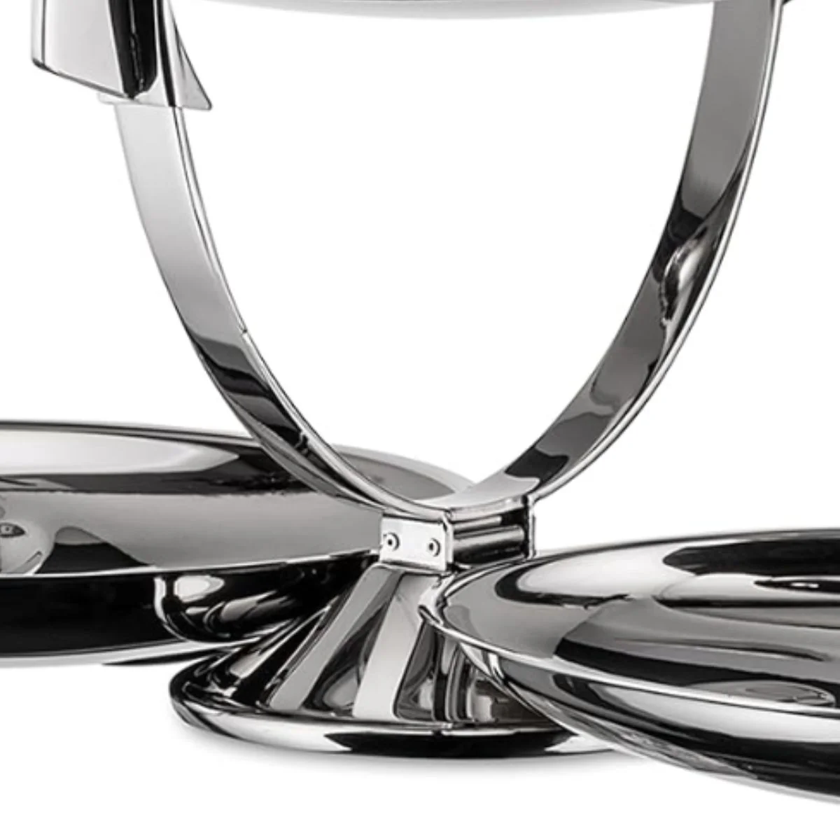 El diseño de este expositor no puede ser más sorprendente. Cuenta con tres bandejas plegables de acero inoxidable que están unidas entre sí a través de una estructura común. Cuando ya no las necesitas, estas bandejas se recogen sobre ellas mismas, cerrándose y convirtiéndose en un fascinante retrato escultórico.