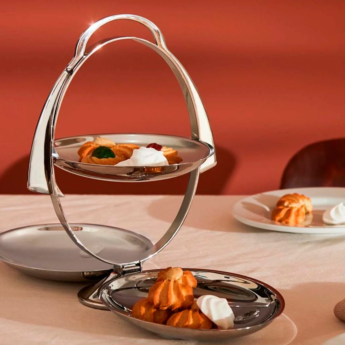 ¿Estás cansado de tener la cocina llena de utensilios que utilizas más bien poco y ocupan mucho espacio? ¿Cuando tienes invitados en casa tienes que traer el postre en más de una bandeja porque todas las que tienes son pequeñas? Con la bandeja expositora plegable de acero inoxidable Anna Gong Alessi podrás solucionarlo y matar dos pájaros de un tiro.