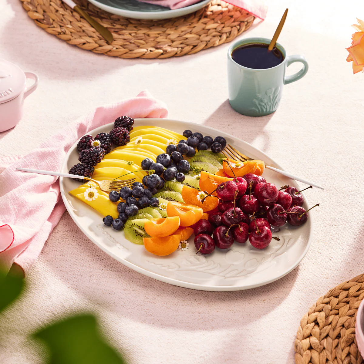 La Bandeja oval cerámica Jardín Le Creuset es una fuente cerámica ovalada que lucirá en el centro de tu mesa como un hermoso ramo de flores. Amplia y de formas suaves, es una bandeja de servir ideal para presentar tus mejores recetas o un generoso plato de quesos y embutidos. Fabricada en cerámica de gres, destaca por su diseño floral en relieve que parece sacado de la naturaleza, perfecto para enamorar a tus invitados.