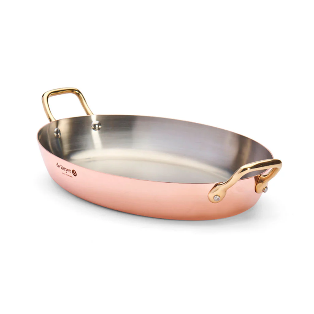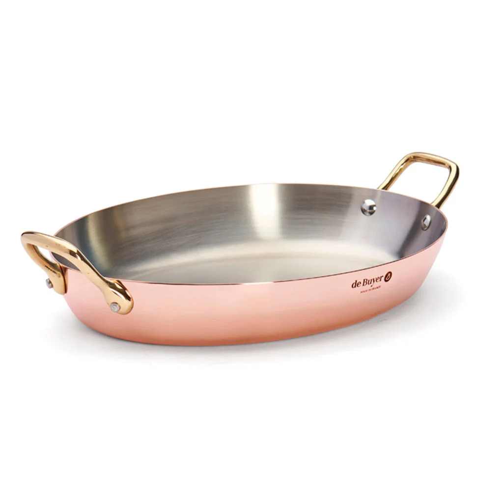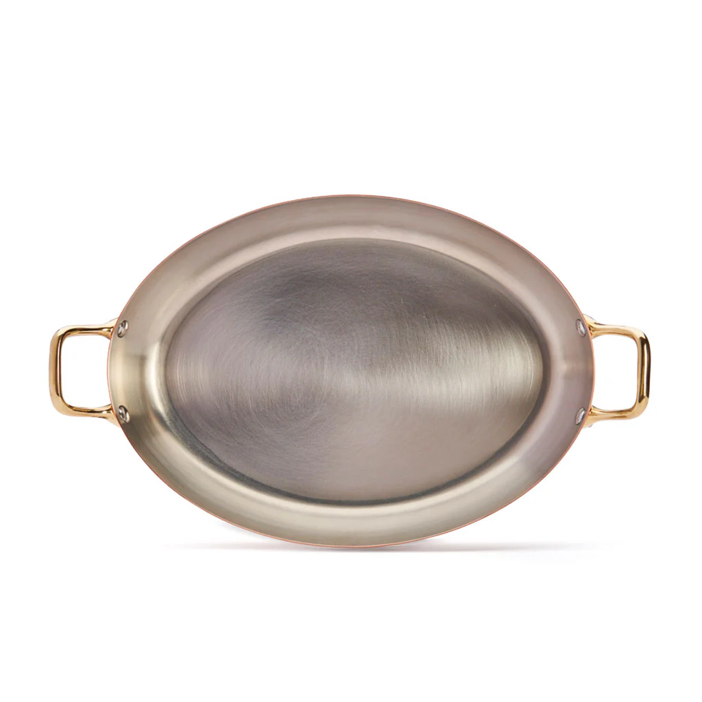 La bandeja ovalada de cobre, material emblemático en la gastronomía francesa, es ideal para cocinar de forma muy eficiente con un fantástico control de la temperatura y con resultados excepcionales. Esta pieza combina tradición e innovación en su diseño y fabricación, en parte artesanal.