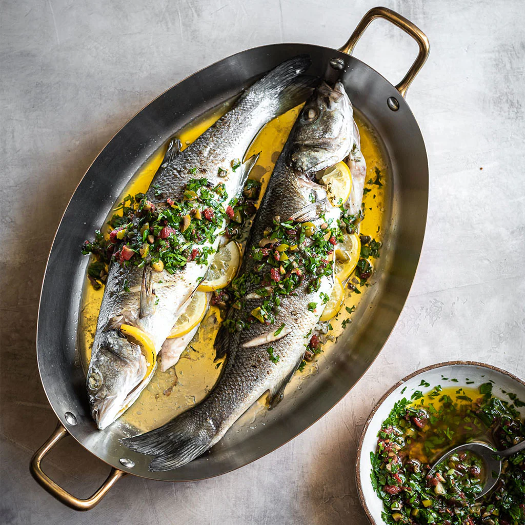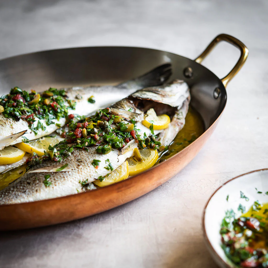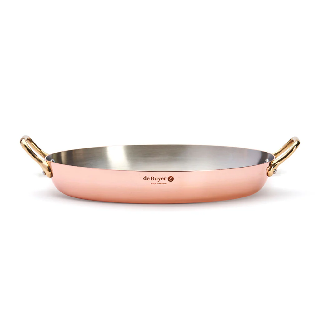 La bandeja ovalada de cobre, material emblemático en la gastronomía francesa, es ideal para cocinar de forma muy eficiente con un fantástico control de la temperatura y con resultados excepcionales. Esta pieza combina tradición e innovación en su diseño y fabricación, en parte artesanal.
