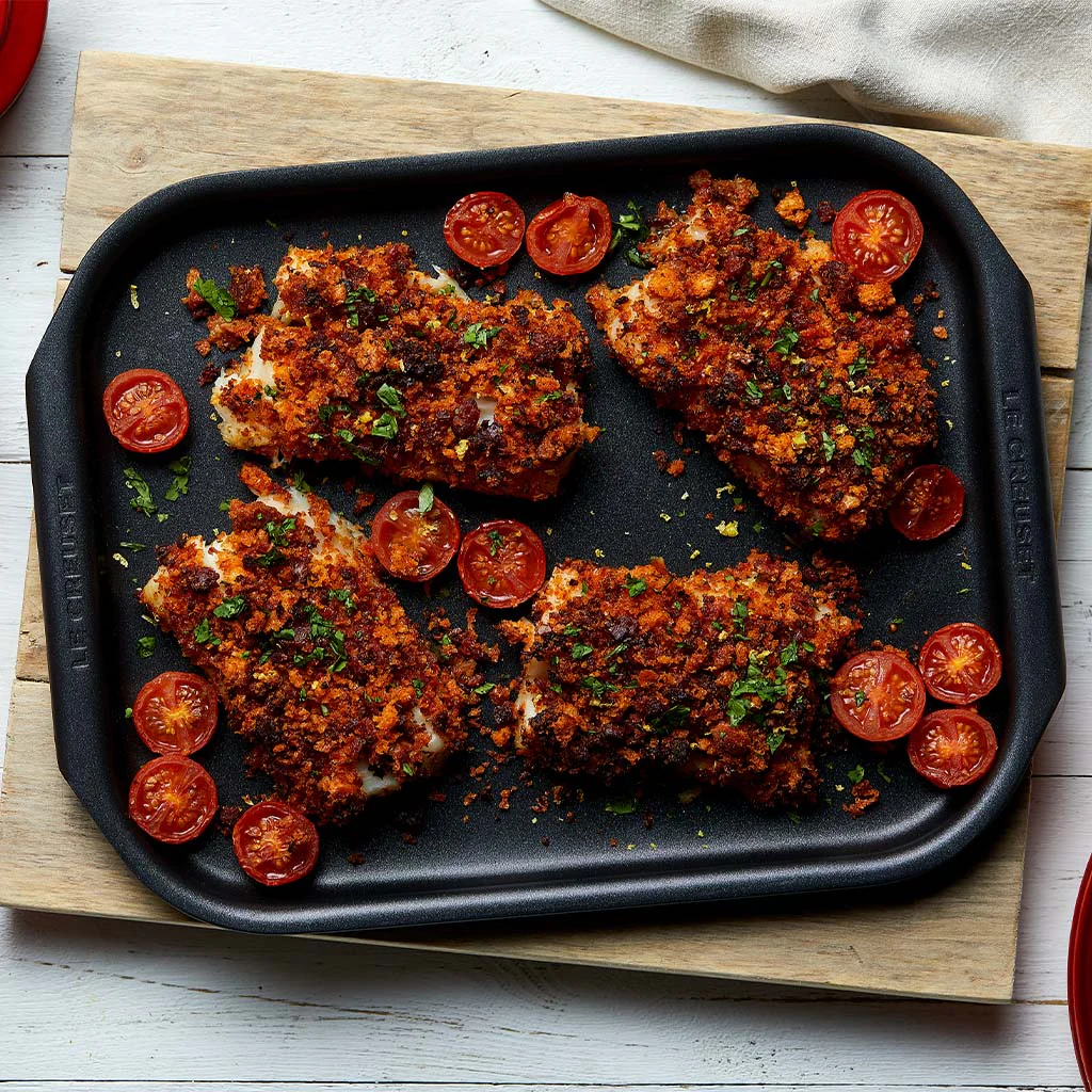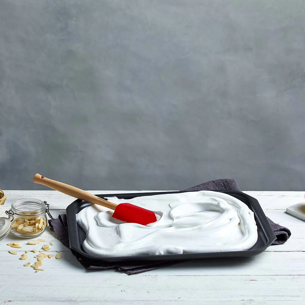 La Bandeja plana Ovenware collection de Le Creuset es una bandeja para horno antiadherente muy versátil, ideal para su uso diario, con la que hornearás cookies, pizzas, verduras, carnes o pescados sin que se pegue nada. Fabricada en aluminio forjado anodizado, logra una distribución homogénea del calor y se limpia tan fácil, ¡que la usarás para todo!