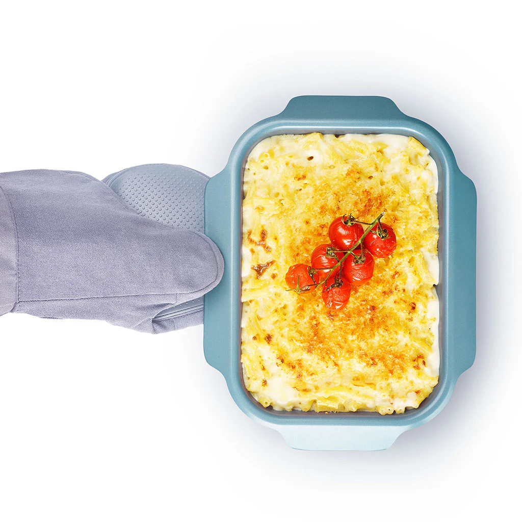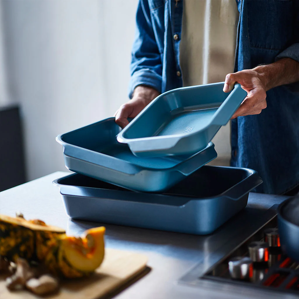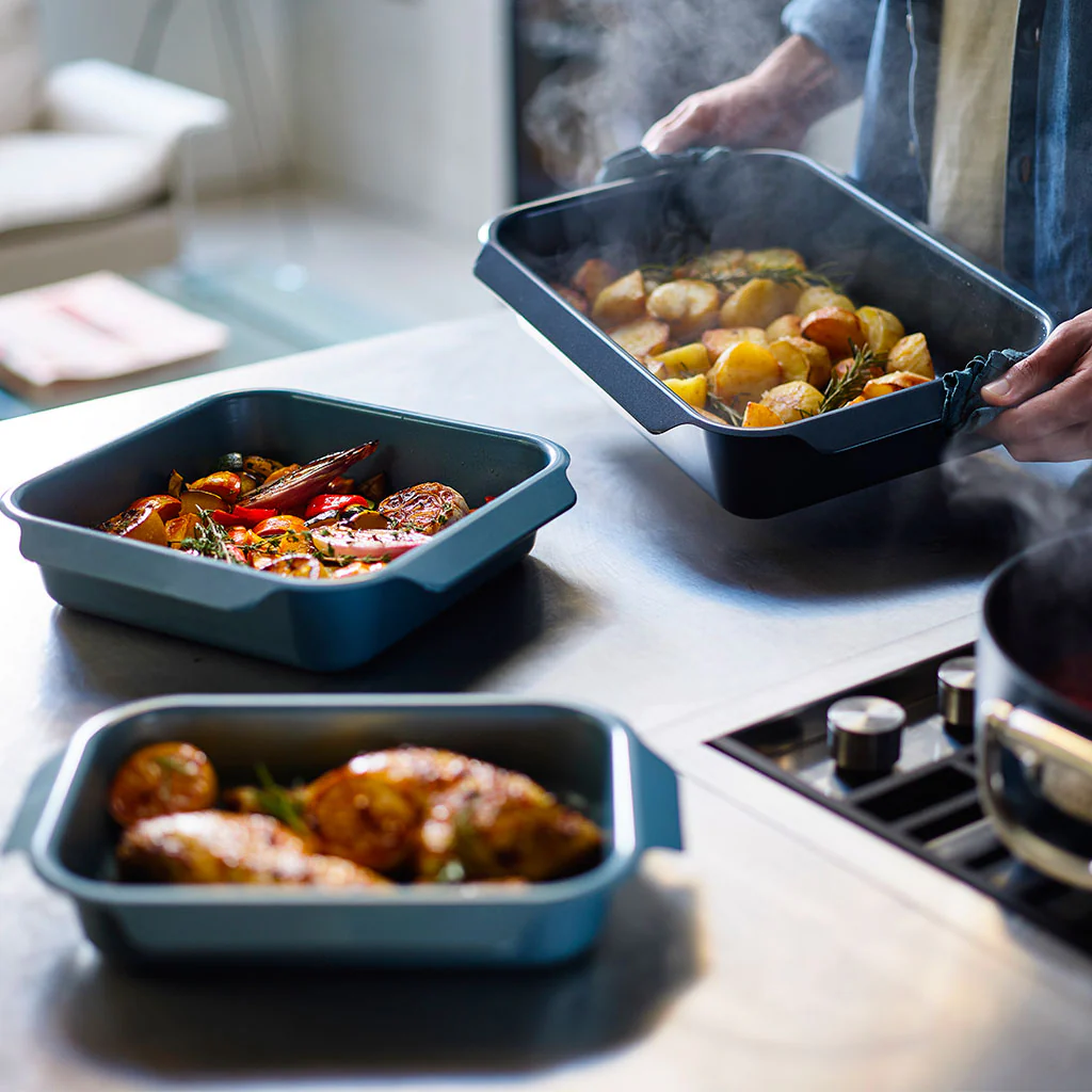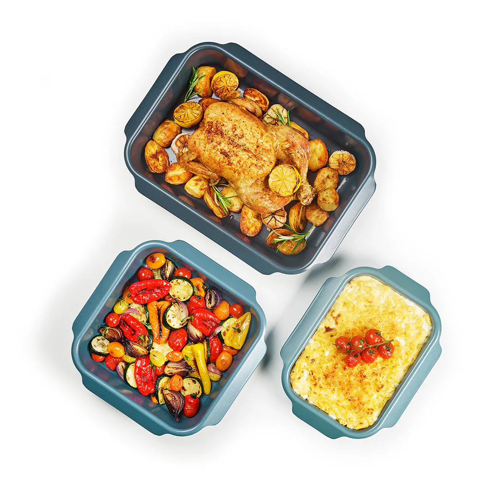 Su diseño cuenta con asas con tirador en sus 4 lados, para que moverlas o sacarlas del horno sea mucho más cómodo, seguro e higiénico. Sus esquinas redondeadas facilitan la limpieza y destacan por su práctico sistema de almacenaje, ya que todas las medidas son apilables y encajan entre sí. Todas las fuentes caben una sobre otra, ocupando el espacio de una única bandeja, pero sin llegar a tocarse, para evitar que puedan arañarse.