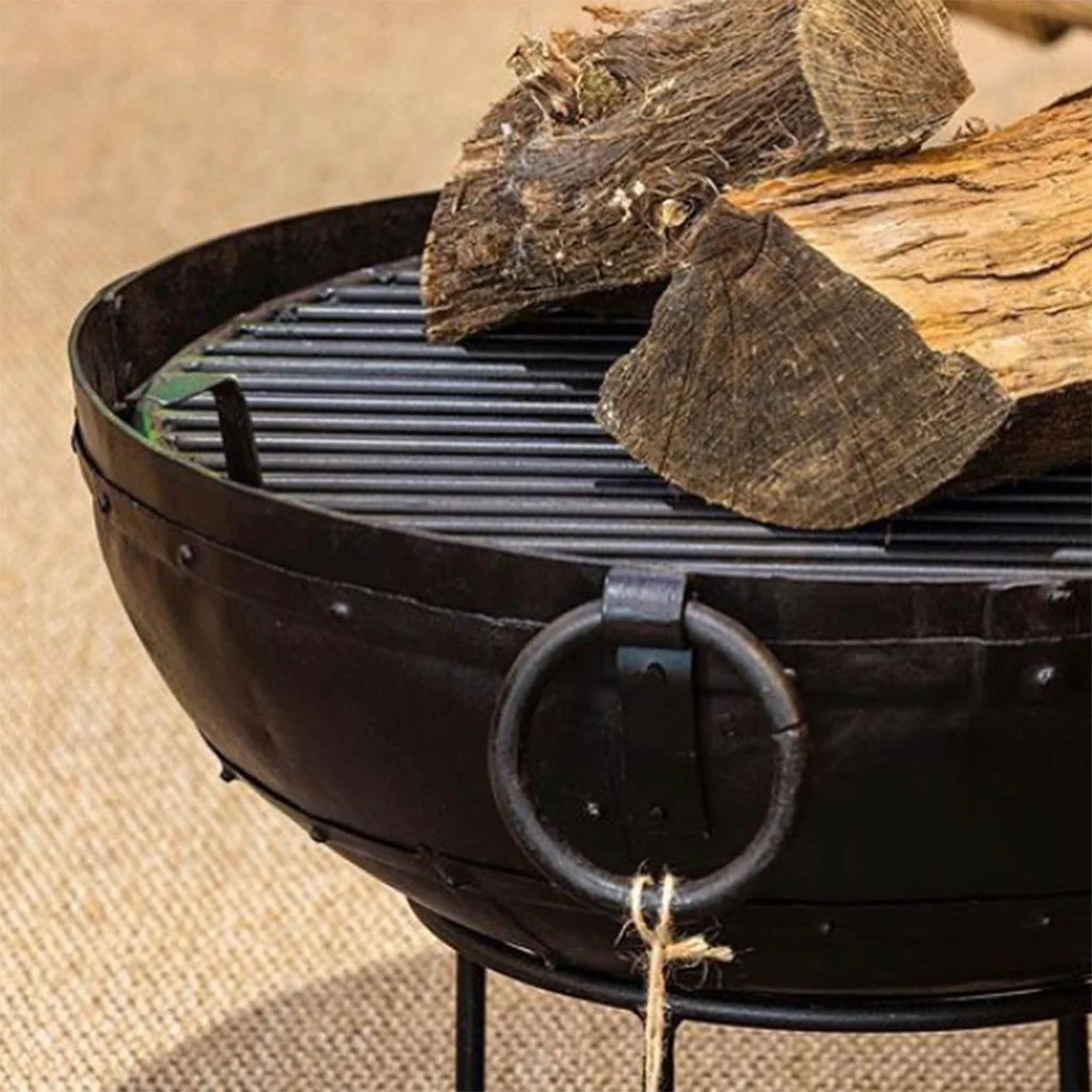 - Incluye parrilla y soporte de tres patas, todo en hierro forjado.