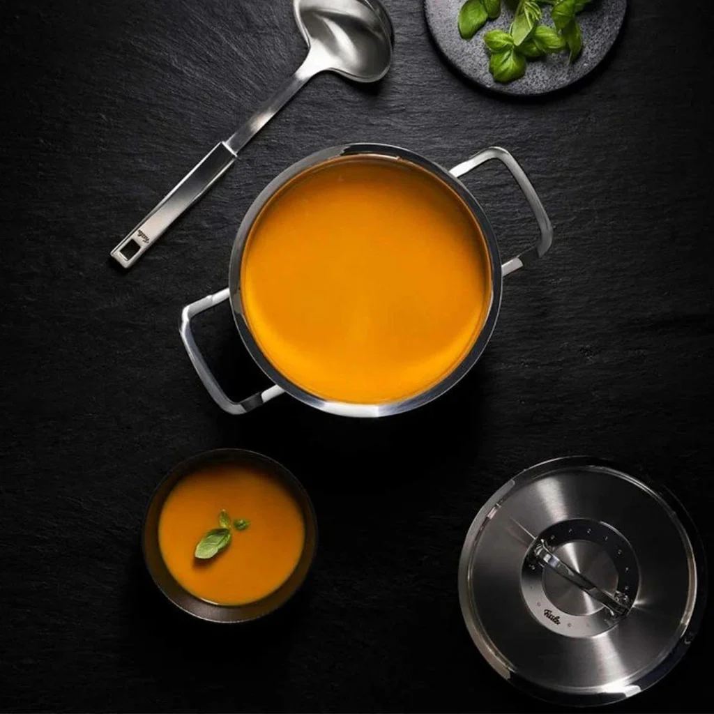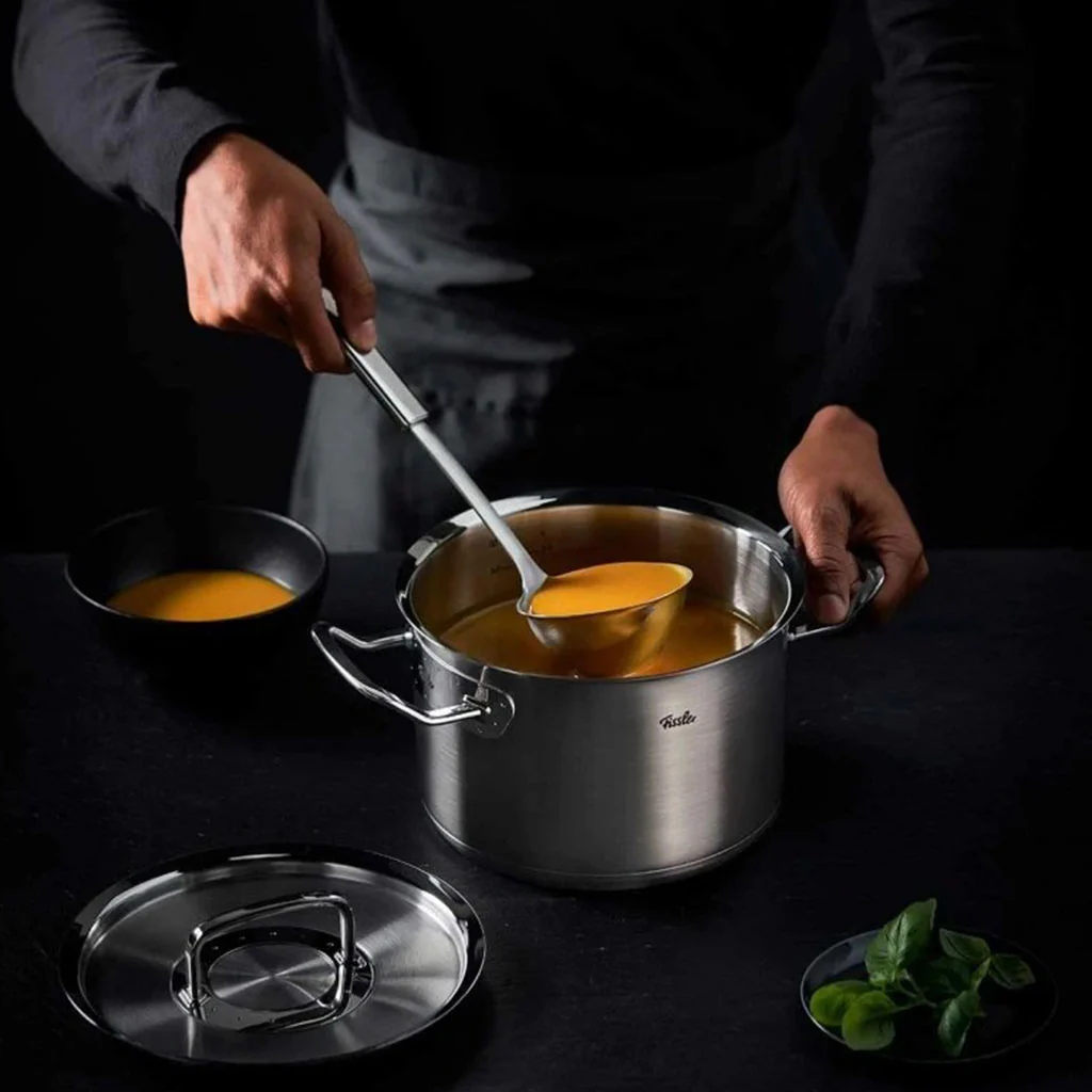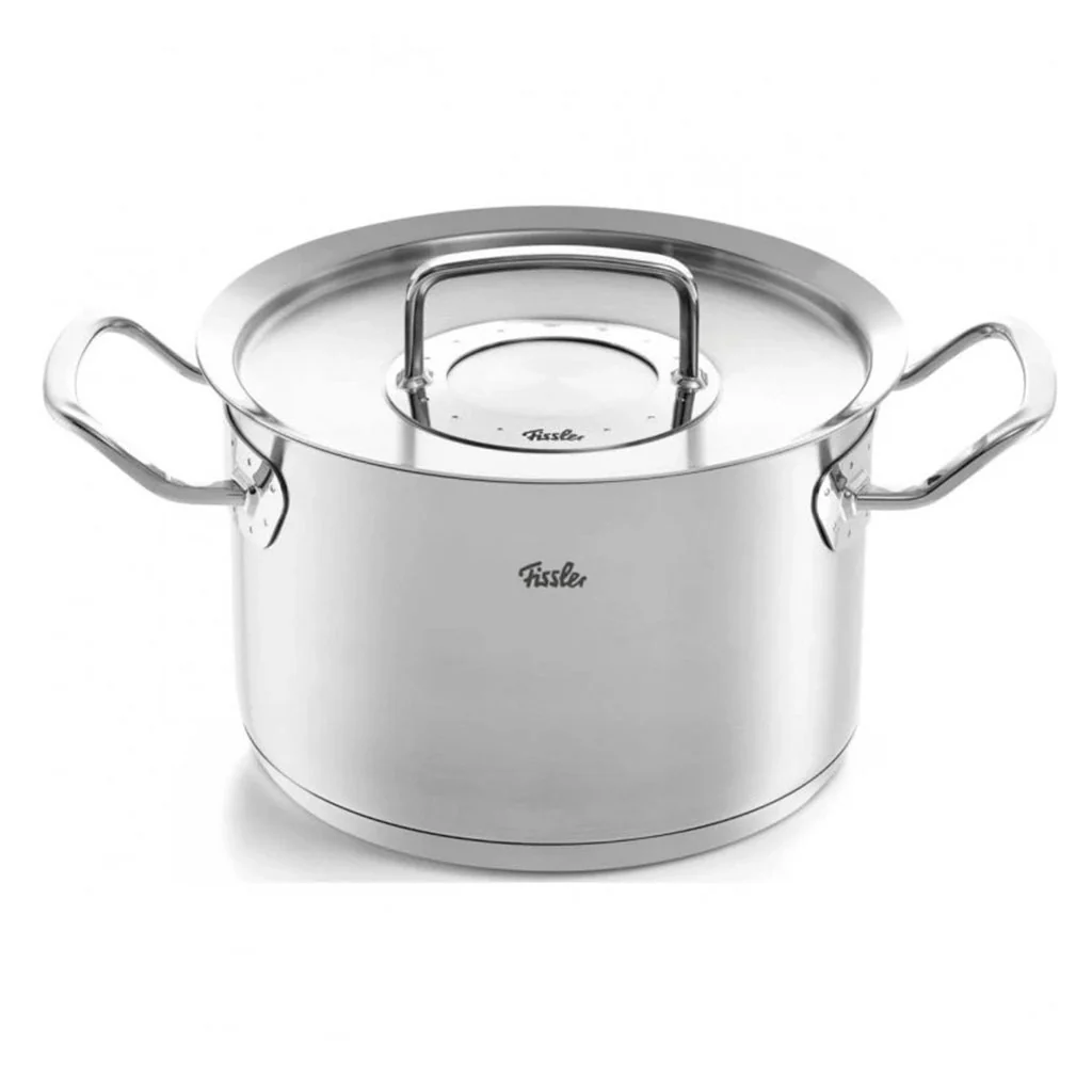 - Su fondo difusor “Cookstar®”, exclusivo de Fissler y energéticamente eficiente. Fondo sándwich de acero inoxidable, con disco de aluminio encapsulado mediante prensado de alta presión, que elimina totalmente el aire interior entre capas, proporcionando una mayor durabilidad y un gran aprovechamiento del calor.