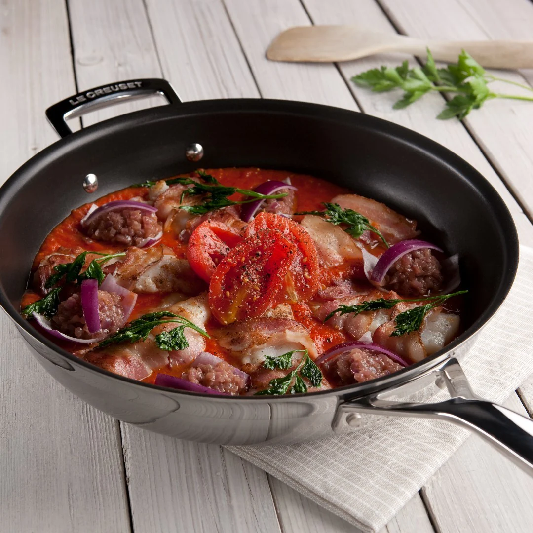 La Batería de 3 piezas de acero inoxidable Le Creuset es un elegante set de 3 piezas prácticas e imprescindibles en la cocina, fabricadas en el mejor acero inoxidable de la marca y con la tecnología multicapa 3-ply. La sartén cuenta con revestimiento antiadherente para cocinar tus recetas más sanas sin que se te pegue nada, aunque cocines casi sin aceite.