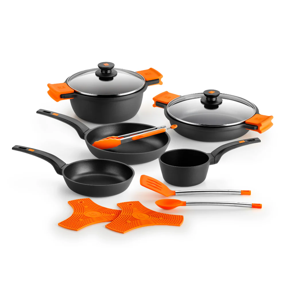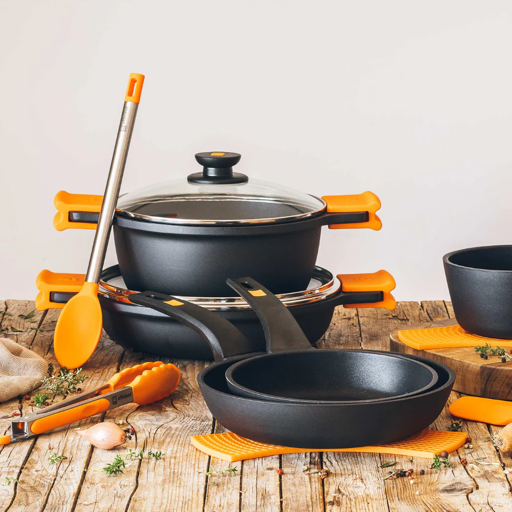 Este completo set incluye sartenes, cacerolas y cazos fabricados con aluminio fundido, extremadamente resistentes a la deformación. Robustas y duraderas a partes iguales, estas piezas cuentan con un potente revestimiento antiadherente, completamente libre de PFOA.