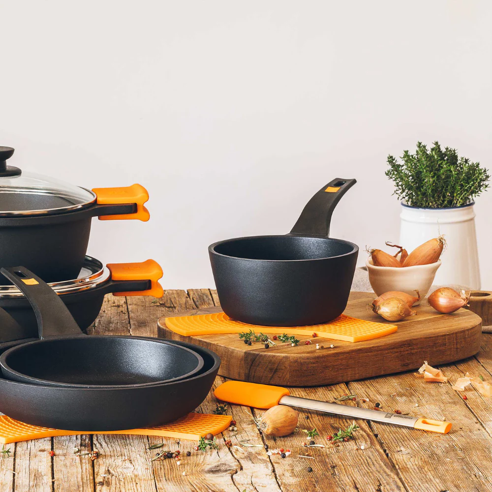 - Mango de cazo y sartenes ergonómico en color negro con logo de BRA en naranja.