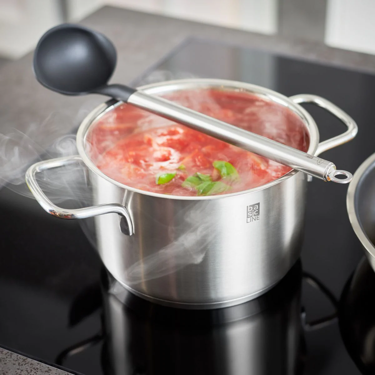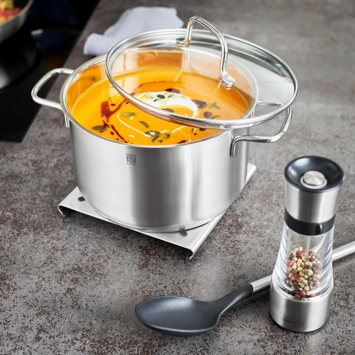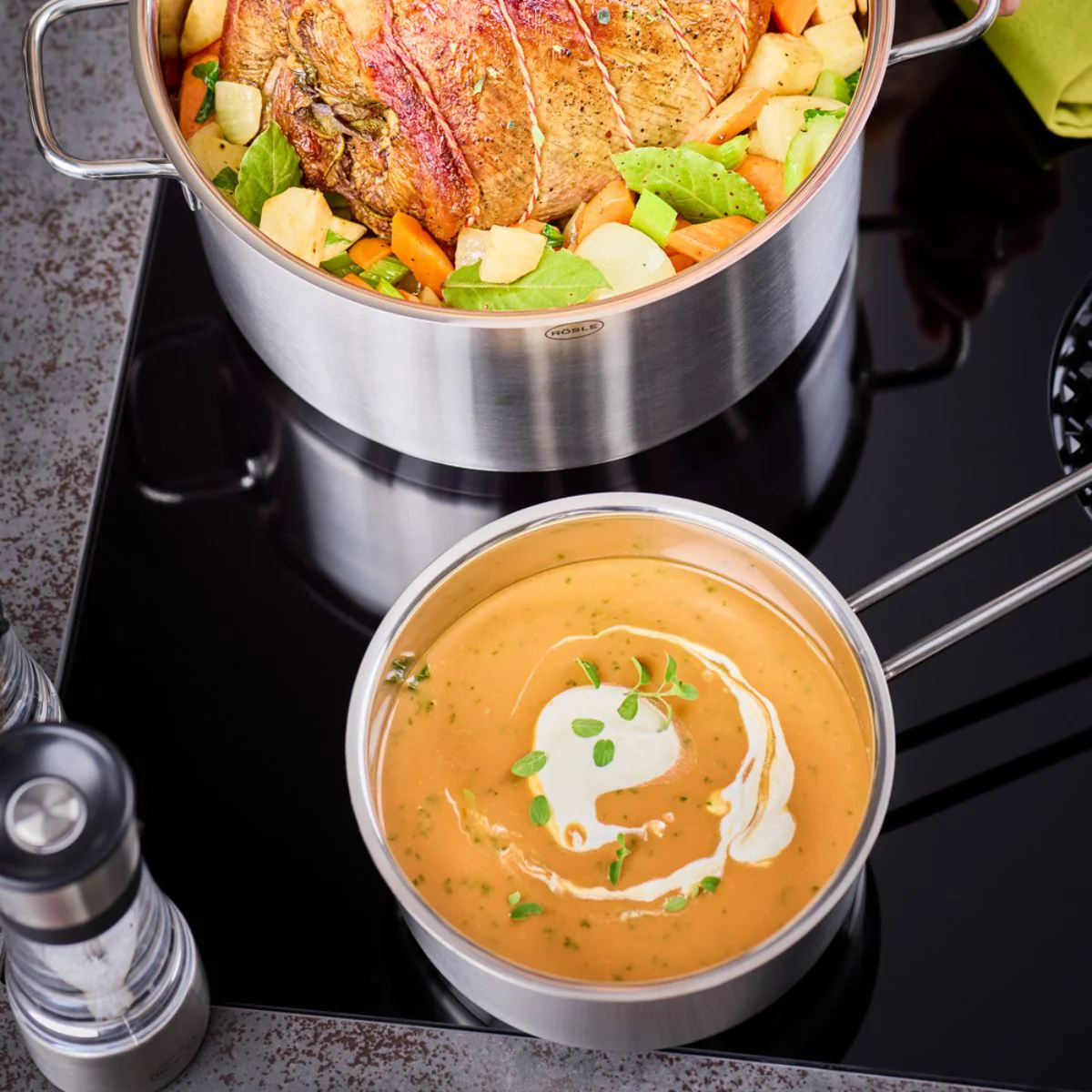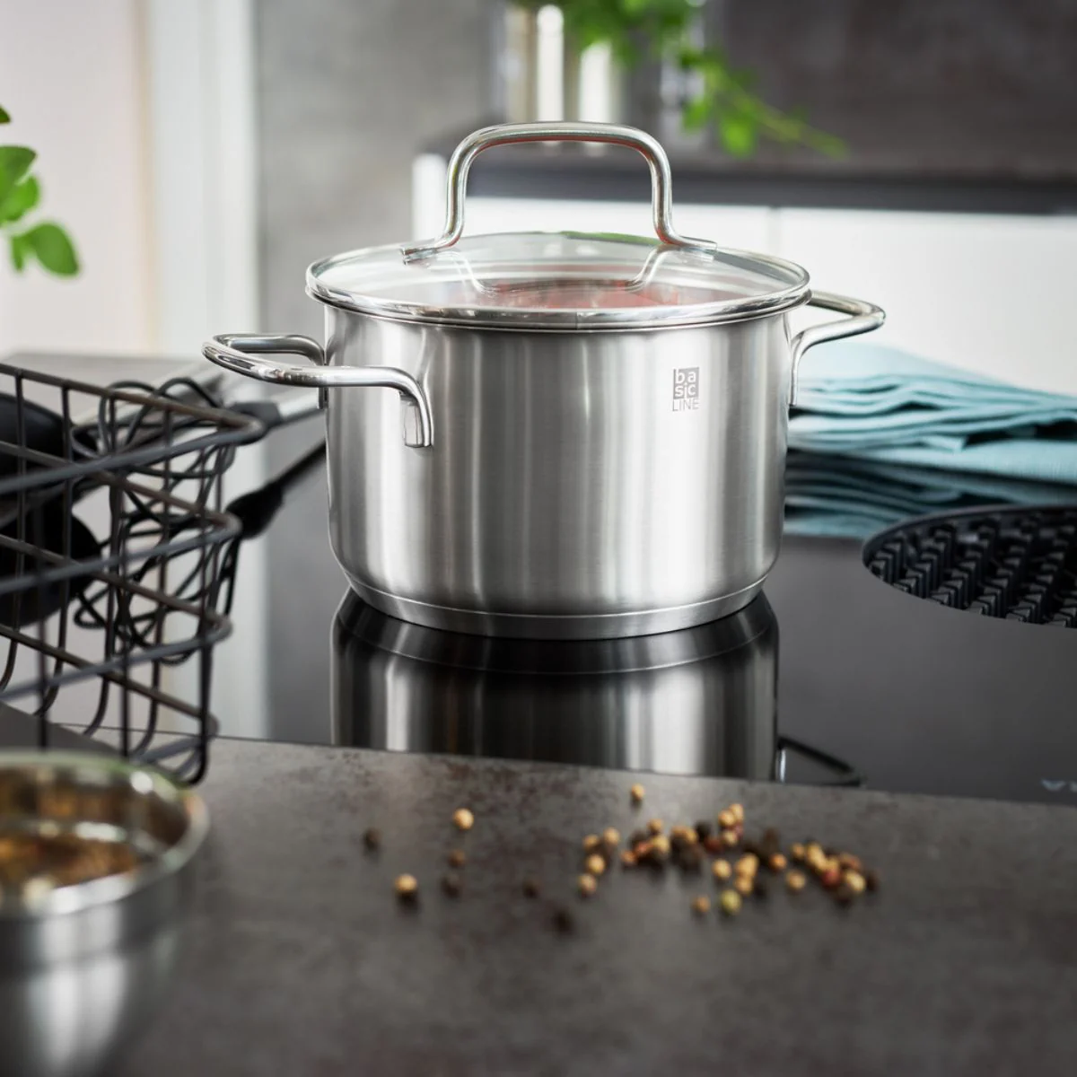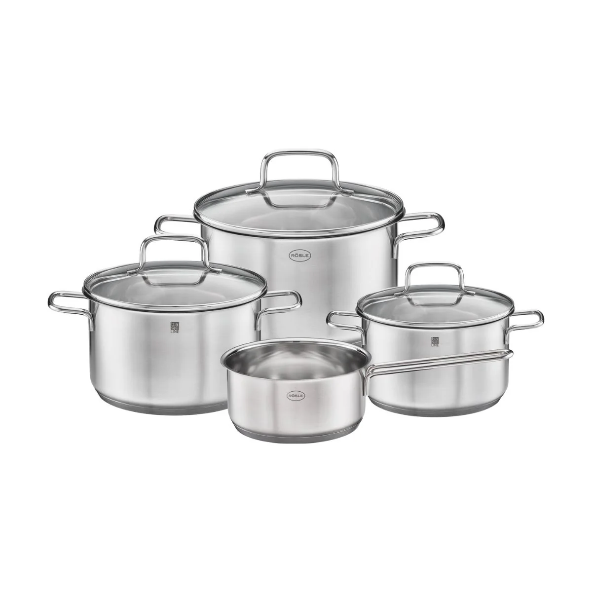 La batería de cocina de 4 piezas Basic Line Rösle contiene 3 cacerolas/ollas altas con tapa y un cazo, las piezas imprescindibles para equipar tu cocina: