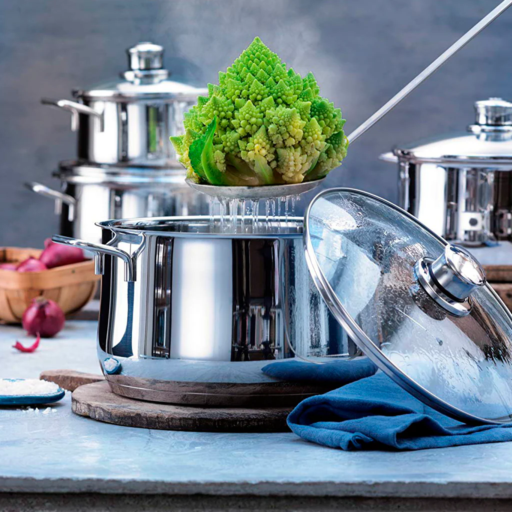 Una batería de calidad, elegante y práctica, pensada para ofrecer estupendos resultados en la cocina durante muchos años. Incluye todas las piezas que puedas necesitar en tu cocina, desde los tamaños más grandes para cuando cocinas para muchas raciones o haces pasta y arroces, a piezas más pequeñas para poder hacer raciones más reducidas, preparar salsas, freír, calentar líquidos…