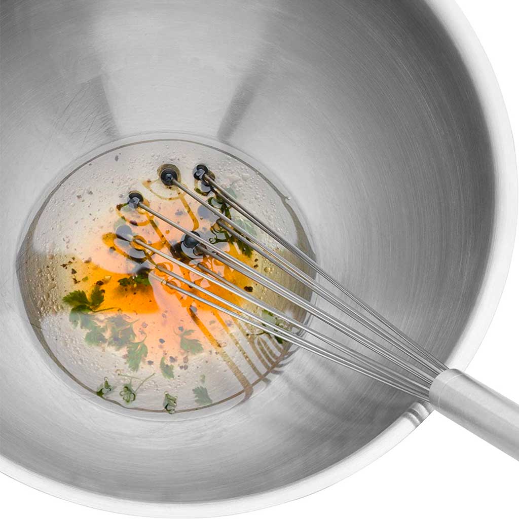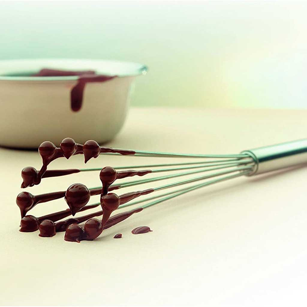 El batidor, con su longitud de 32 cm, es perfecto para batir los huevos sin incorporar aire al preparar flanes o tocinos de cielo, o incluso unos estupendos huevos revueltos. Con él conseguirás una textura suave y homogénea en salsas y cremas. ¡Es un utensilio estupendo para los amantes de la repostería y para los buenos cocinillas!
