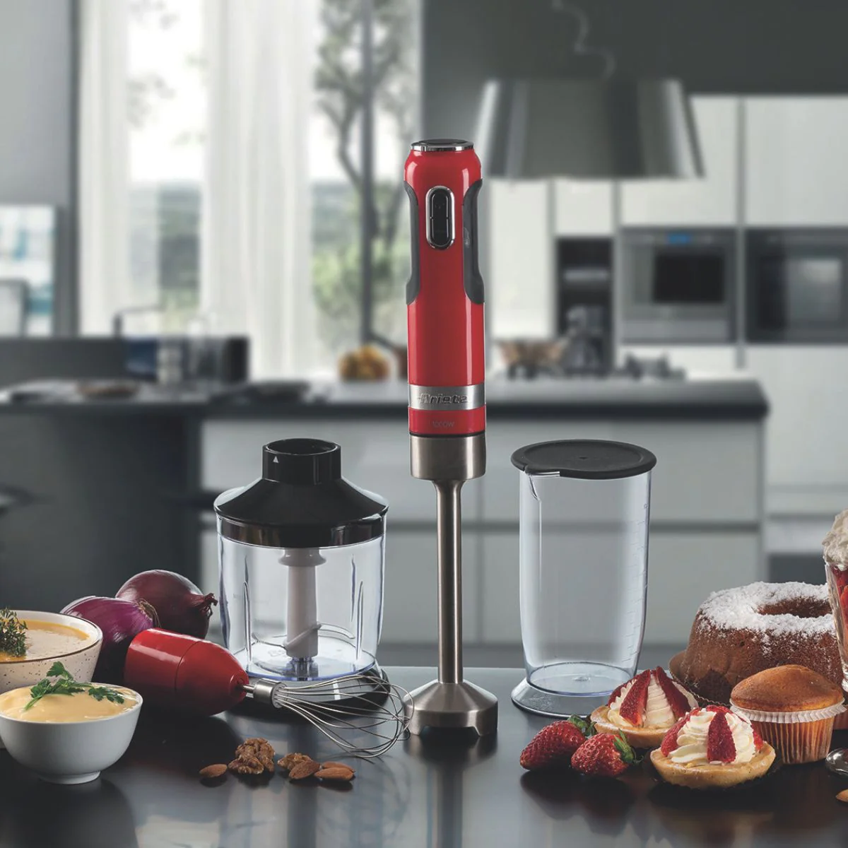 Está disponible en tres colores diferentes: rojo, negro y blanco, para que puedas elegir cuál de ellos combina mejor con las tonalidades de tu cocina. El pack incluye el accesorio batidor, el triturador, un vaso mezclador de 700ml de capacidad y una picadora de 500ml. ¿Más fácil imposible, no?