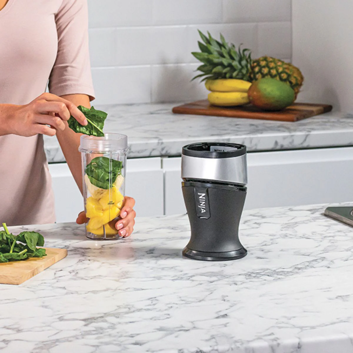Con la Batidora individual para smoothies Ninja® prepararás tus bebidas más nutritivas en un abrir y cerrar de ojos. Su tamaño es perfecto para cualquier cocina, ya que ocupa poco espacio. Gracias a sus eficientes cuchillas de acero inoxidable, tritura y bate fácilmente desde frutas y verduras a ingredientes más duros, como frutos secos, semillas e incluso hielo. Además, incluye dos vasos portátiles para que puedas llevar tu smoothie al salir de casa y dejar otro preparado en la nevera.