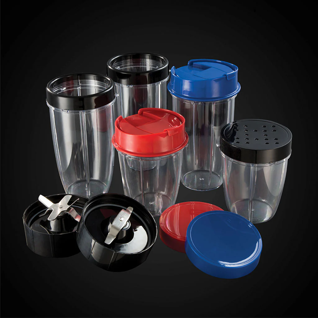 Con su base de acero inoxidable cepillado, le dará un toque elegante a tu cocina. ¡Es muy bonita! Además, viene con 5 vasos: 3 grandes de 700 ml y 2 pequeños de 350 ml, ideales para toda la familia. También incluye tapas súper prácticas: una para espolvorear, dos para guardar y dos para beber sobre la marcha. ¡Incluso tiene protectores para el borde, así que podrás disfrutar de tu batido cómodamente!