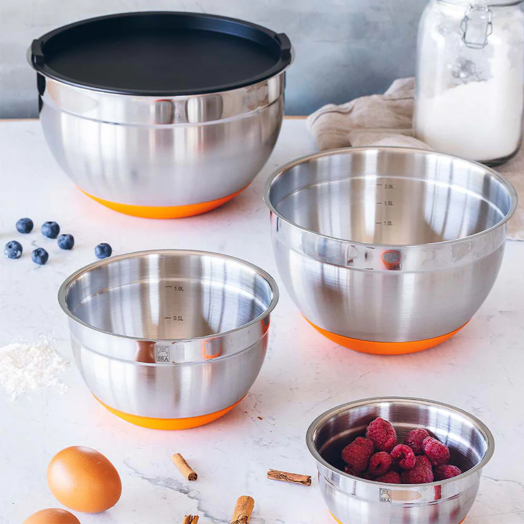 El Bol de acero inoxidable Efficient de Bra es un imprescindible en tu cocina. Este cuenco con tapa y base de silicona es un recipiente ideal para preparar, servir y conservar la comida tapada y en perfecto estado durante más tiempo. Tanto si eliges una sola medida, como si prefieres un set con varios tamaños, ¡acertarás!
