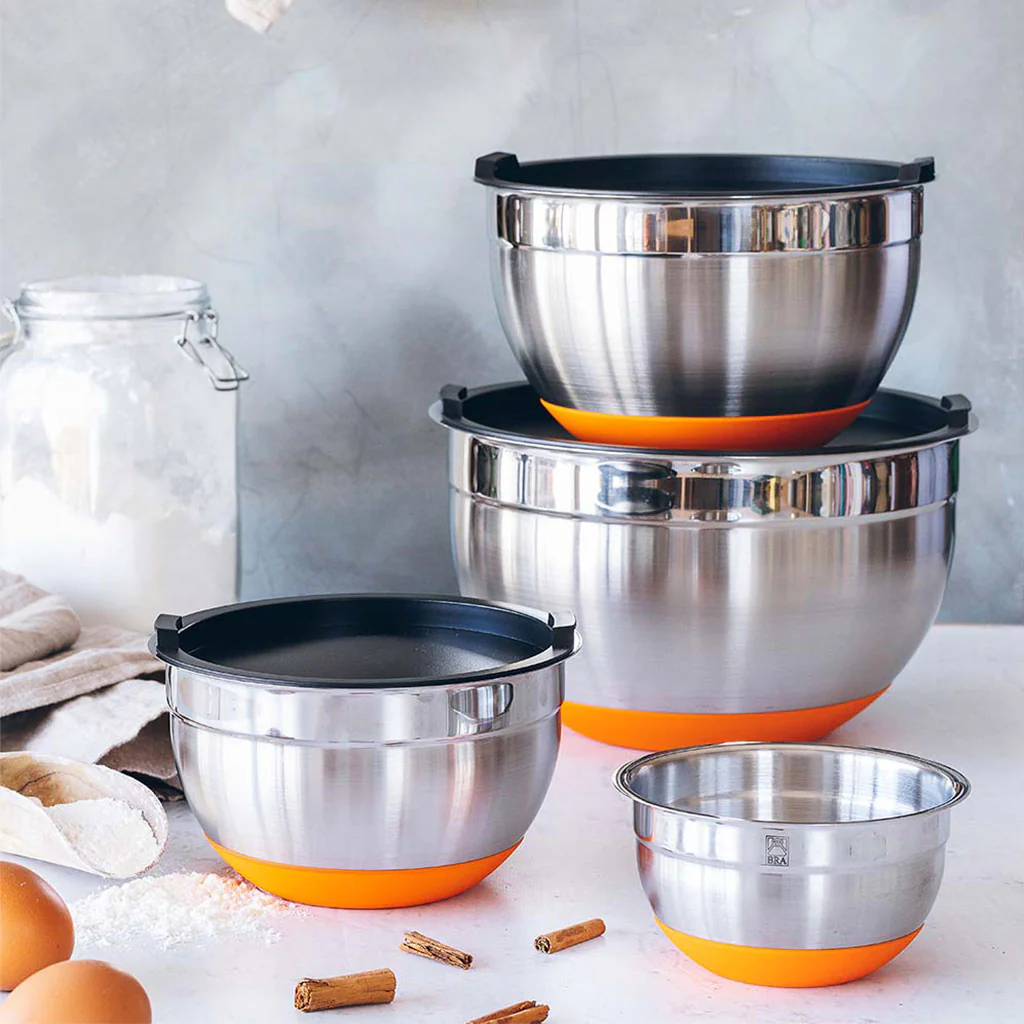 La base antideslizante de silicona naranja, el color de la colección Efficient que es la más icónica de Bra, te ayuda a manejarlos con comodidad, ya que evita que se mueva mientras mezclas, aportándole estabilidad.