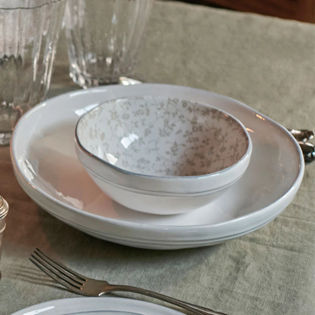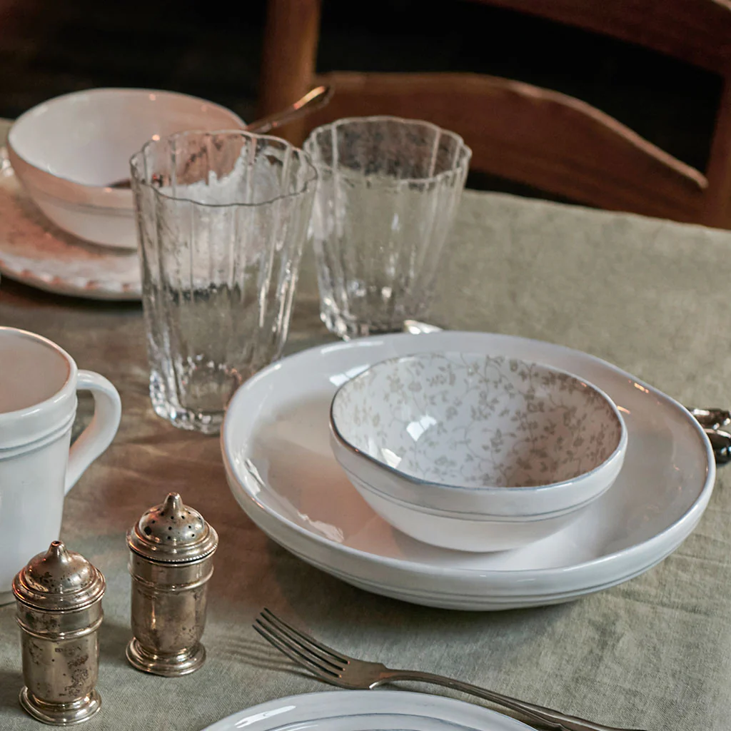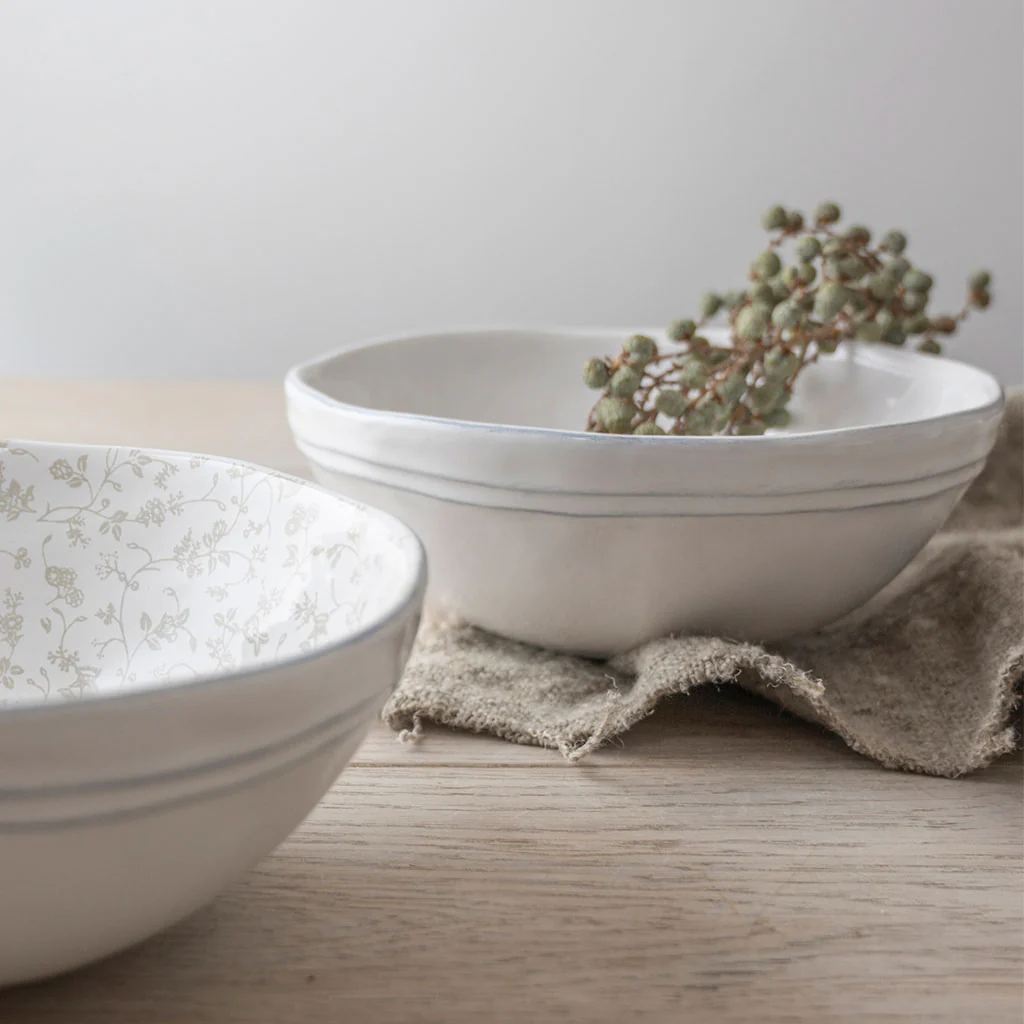 El bol cerámico Artisan Collection de Laura Ashely se presenta en dos formatos y en los dos diseños de la colección, totalmente blanco con líneas grises y blanco con sutiles flores estampadas en su interior: