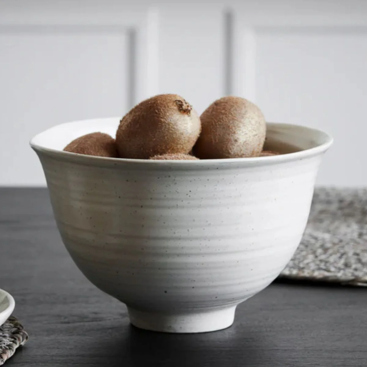 El Bol ensaladera de gres Pion House Doctor es un amplio cuenco de gres que lucirá allí donde quieras colocarlo. Perfecto para presentar tus ensaladas, como frutero en el centro de la mesa o para servir el pan de la comida, su elegante color blanco con suaves motas grises y su textura mate lo hacen ideal para combinar con tu vajilla, sea cual sea su estilo o tono. Su borde irregular le confiere un aspecto único y encantador.