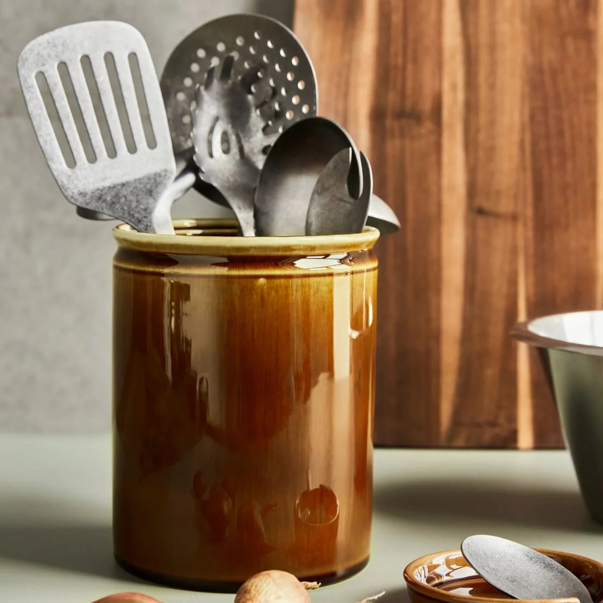 Este bote de gres de Nicolas Vahé es mucho más que un bote para utensilios de cocina: es una pieza decorativa con alma, que aporta calidez y un aire retro a cualquier cocina. Su esmalte marrón suave, con un brillo sutil y acabado artesanal, le da un carácter atemporal que encaja igual de bien en una cocina moderna que en una más clásica.