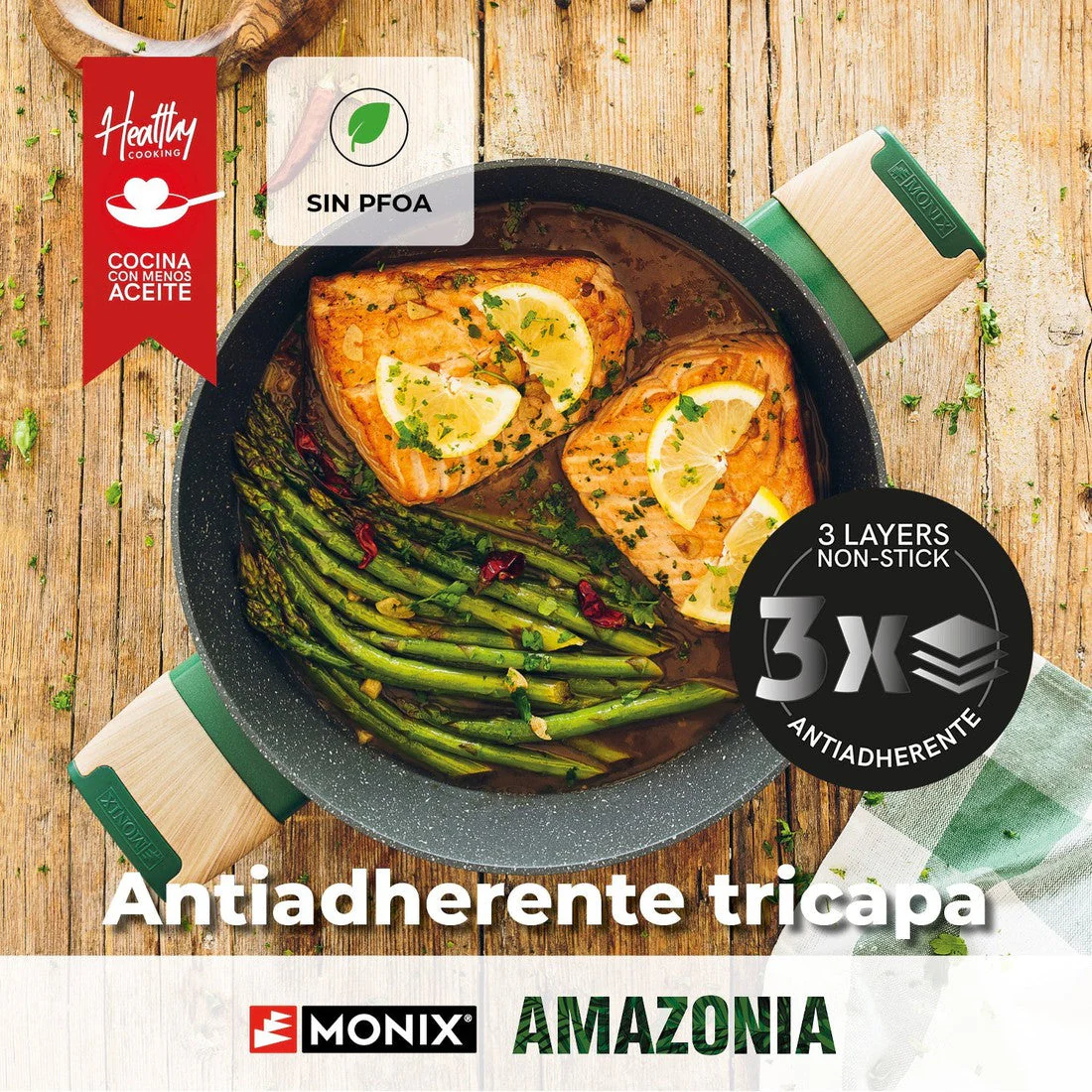 La Cacerola Alta Amazonia de Monix es una combinación perfecta de funcionalidad y estilo. Se trata de una olla antiadherente de 3L de capacidad, que formando parte de la colección Amazonia, no solo te ofrece un buen rendimiento en la cocina, sino que también refleja un compromiso con la sostenibilidad y el cuidado del medio ambiente.