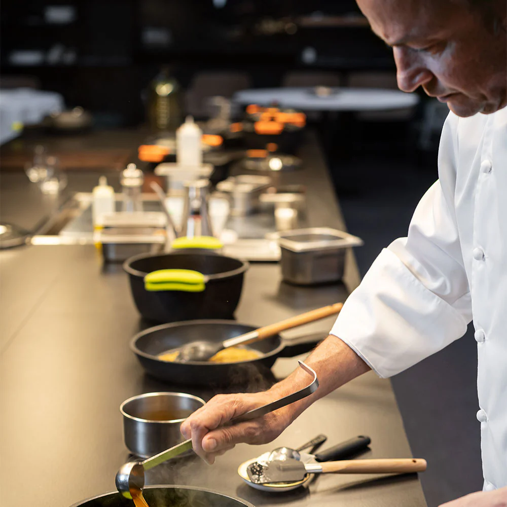 Esta cacerola está disponible en cuatro tamaños distintos, cada uno de los cuales tiene su tapa y sus asas a juego. Con un diseño ergonómico y aislamiento del calor, tanto las asas como el pomo de la tapa ofrecen un cómodo manejo libre de quemaduras.