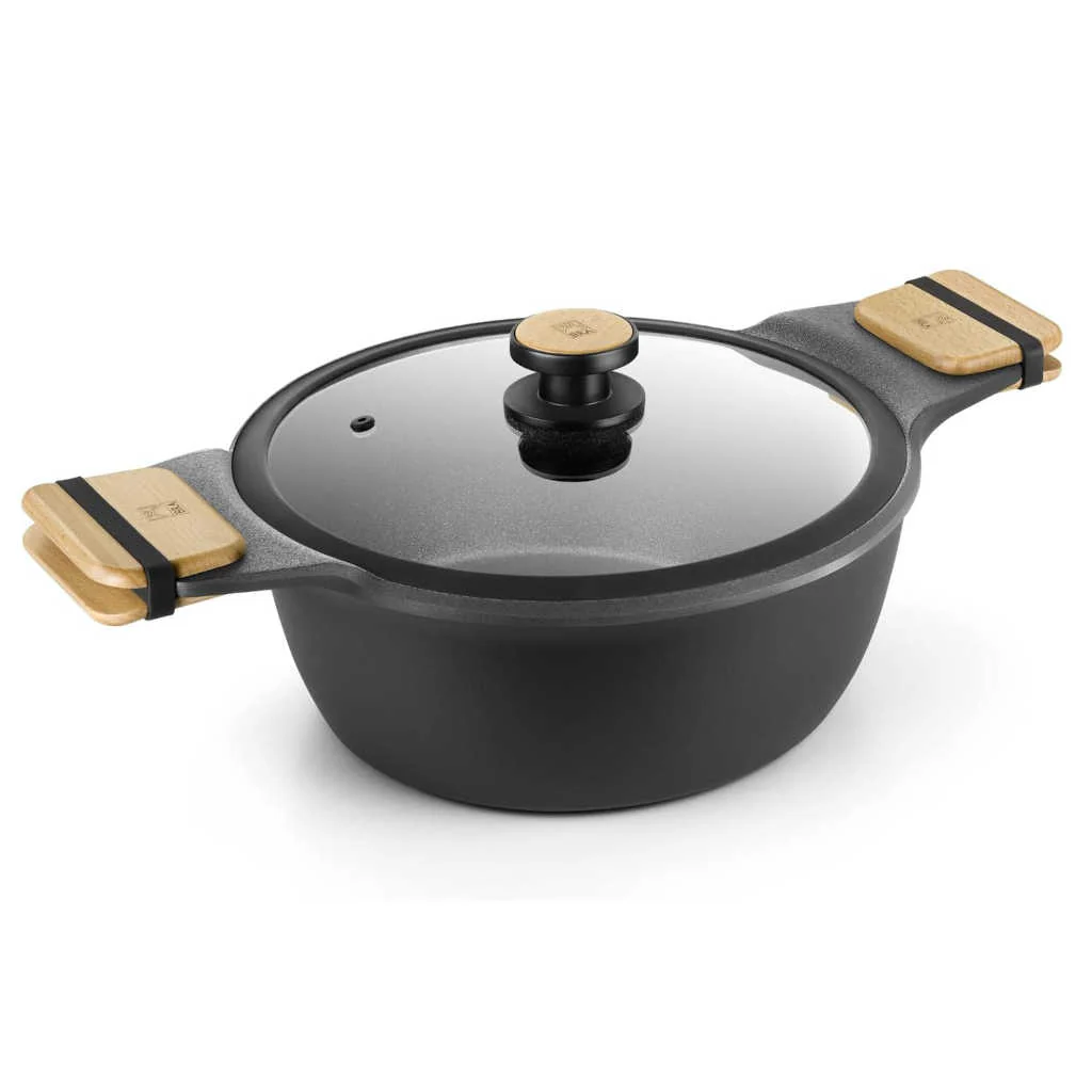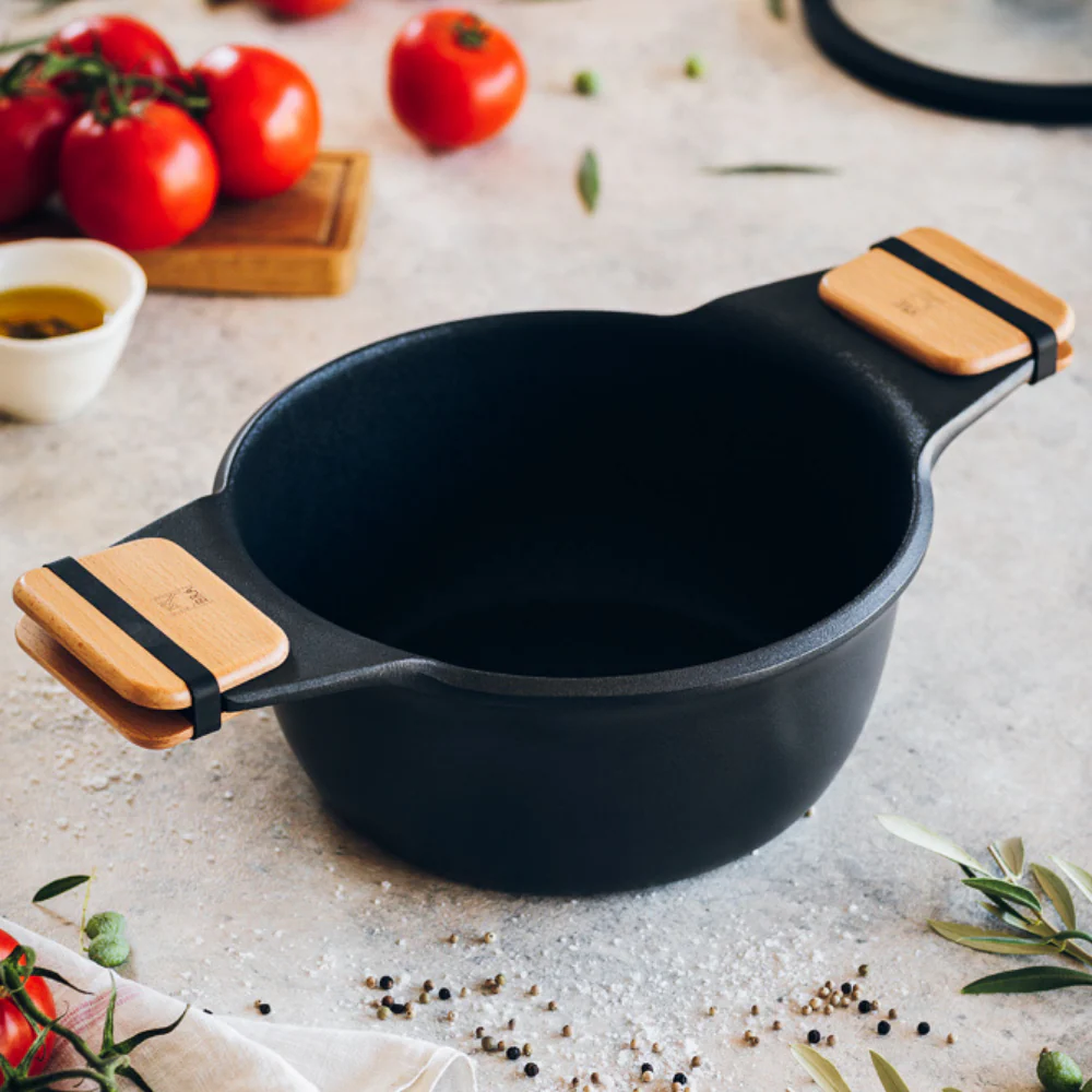 Incluye dos asas de madera extraíbles, con los que podrás coger la cacerola con comodidad (¡Y le aporta un look precioso a la cacerola!). Además, dispone de una tapa de cristal con borde de silicona para conseguir un cierre perfecto y a través de la cual podrás seguir la evolución de tus recetas sin necesidad de abrir la tapa, conservando así la temperatura y cocción en todo momento.