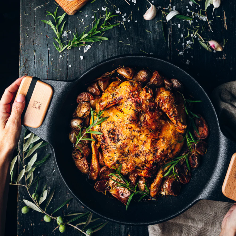- Cuerpo apto para horno hasta 220ºC sin asas. (usar en el horno sin la tapa de cristal y las asas de madera).