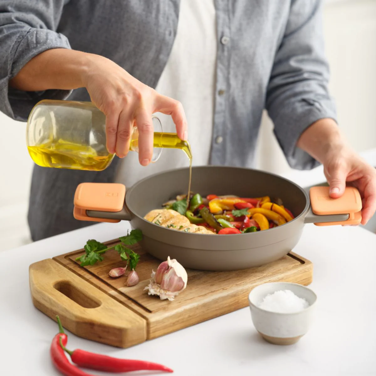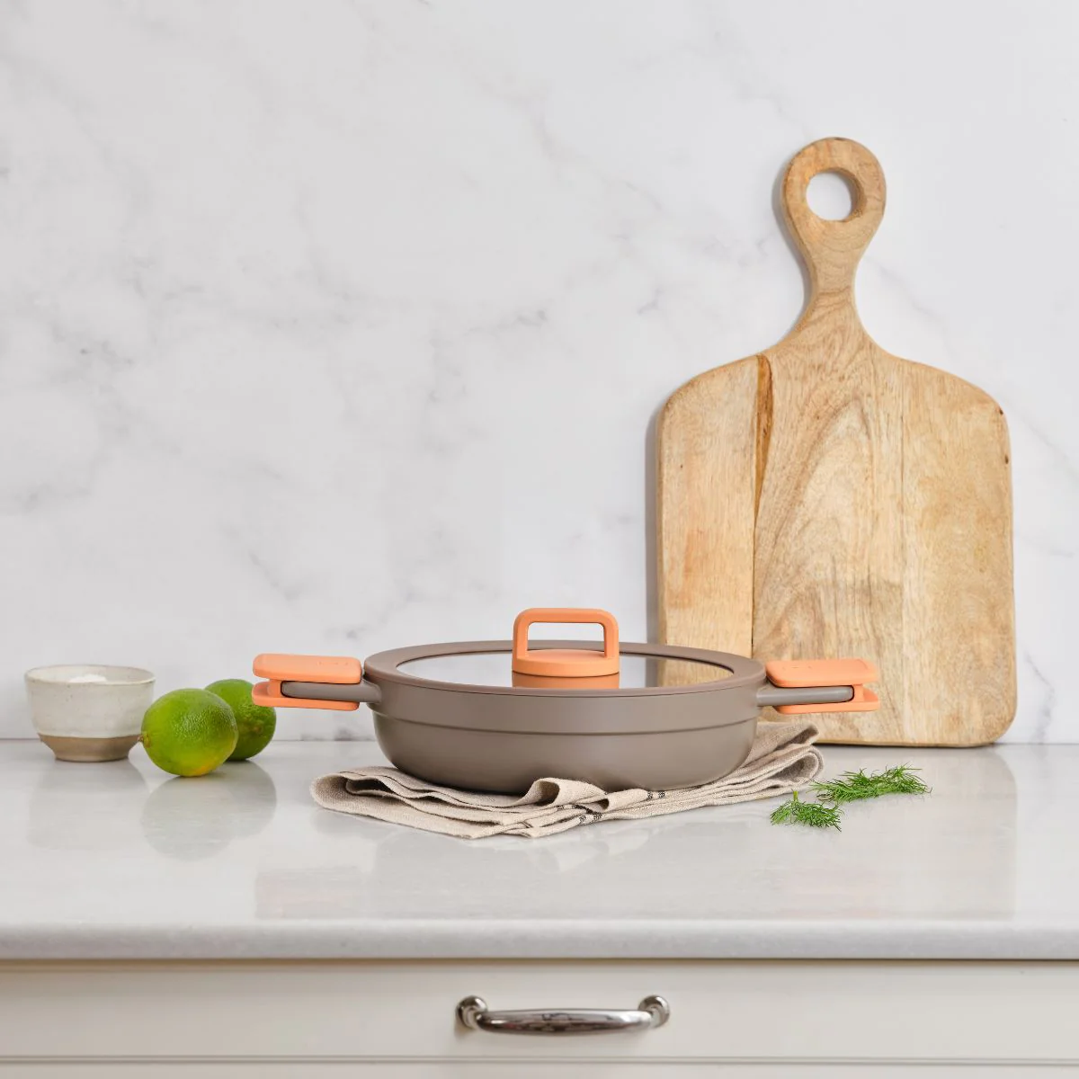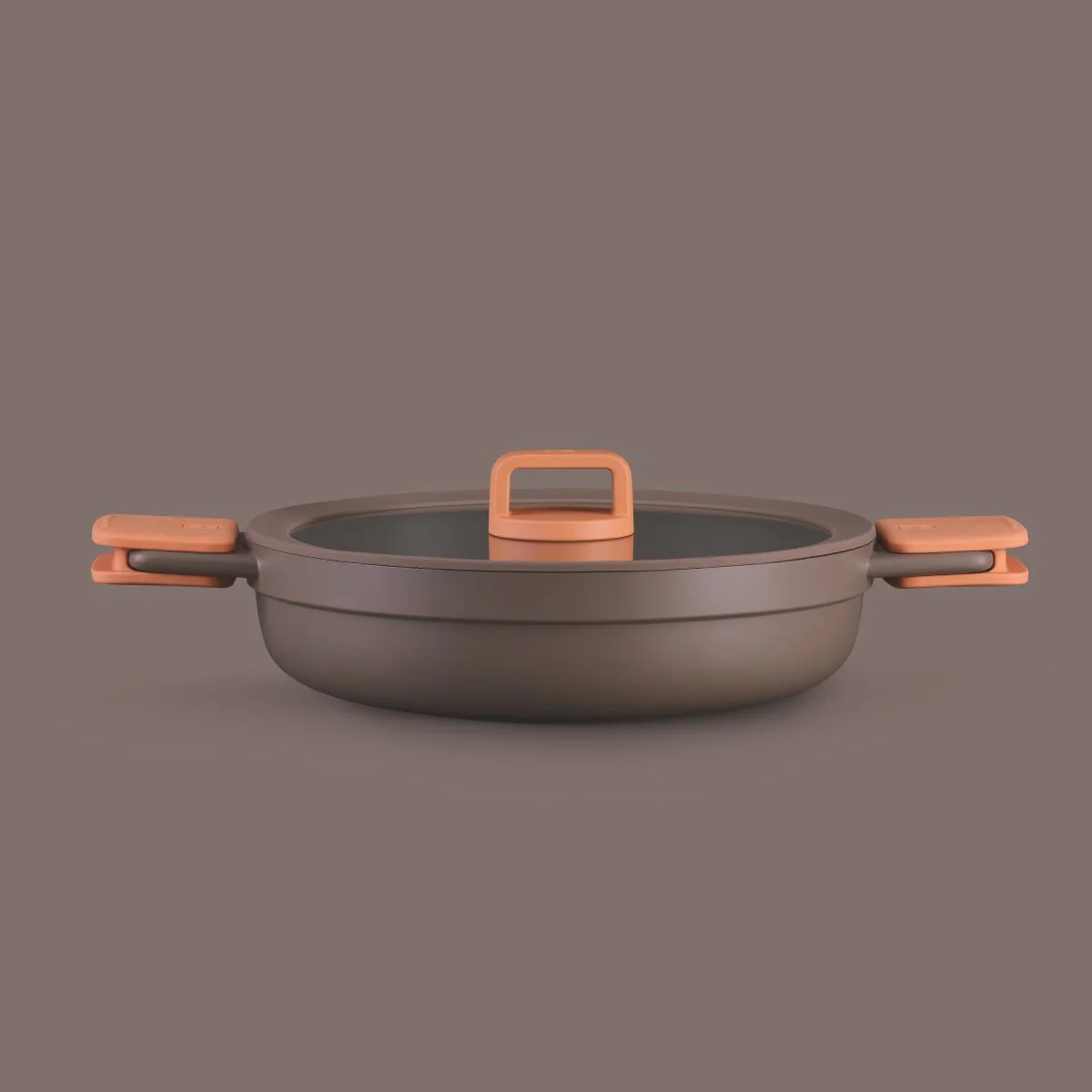 - Cacerola baja antiadherente con diseño apilable para un almacenamiento eficiente.