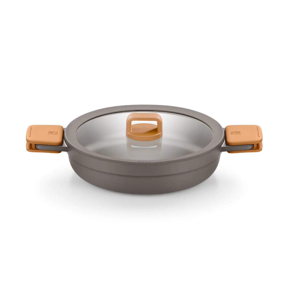 La cacerola baja forma parte de la colección Compac Pro de Bra, la gama premium de menaje antiadherente diseñada para optimizar el almacenaje en tu cocina gracias a su innovador diseño apilable, que ahorra espacio sin renunciar a la calidad.