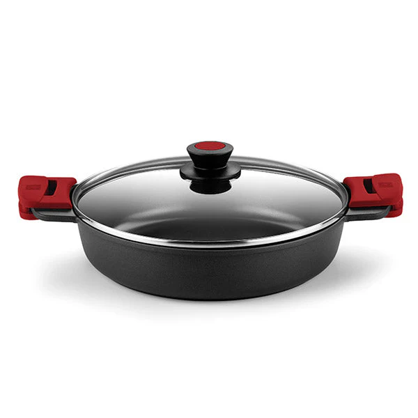 La cacerola baja Premiere destaca por ser polivalente y está disponible en cuatro tamaños distintos, cada uno de los cuales incluye su tapa de cristal y las asas correspondientes. La tapa de cristal es muy cómoda porque permite controlar la cocción en todo momento sin necesidad de levantarla. Además, el pomo de la tapa cuenta con un diseño ergonómico que facilita su manejo. Tanto el pomo como las asas aíslan el calor con la finalidad de evitar quemaduras inoportunas.