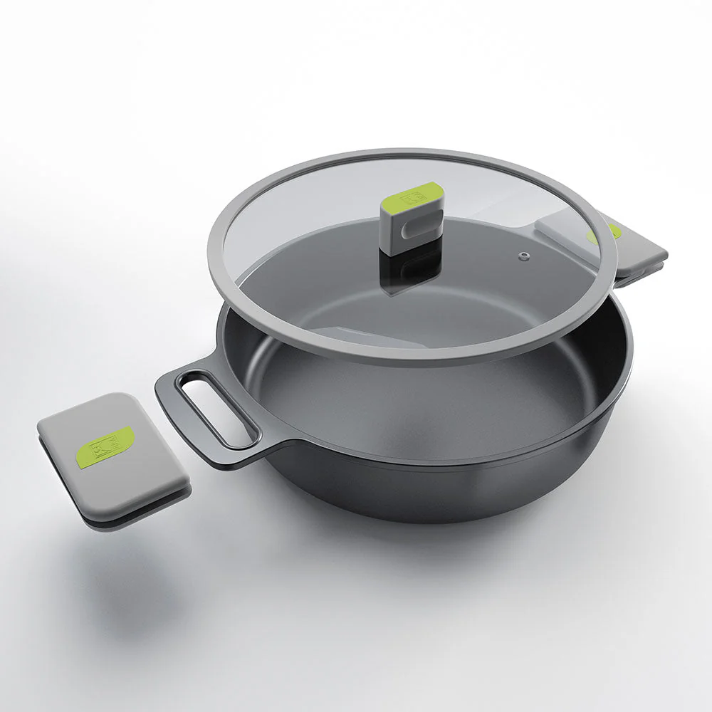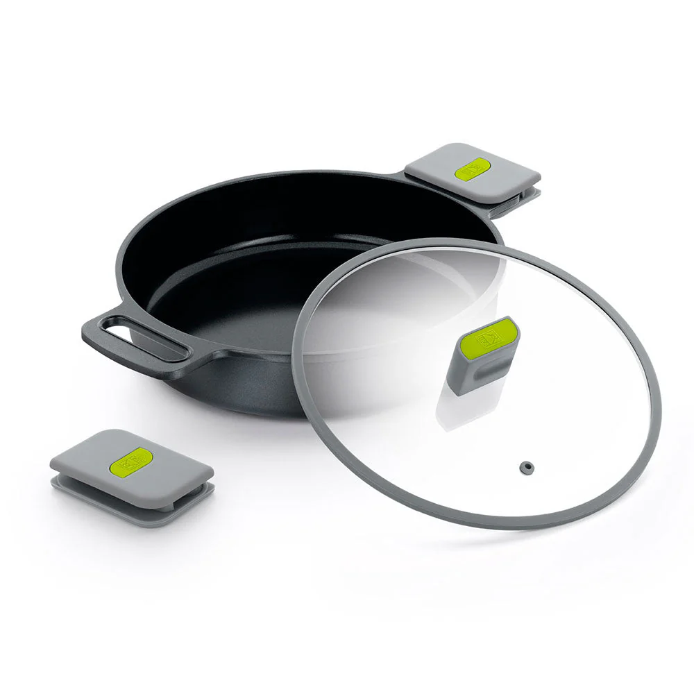 - Incluye tapa de cristal y asas ergonómicas desmontables de silicona en color gris con detalle en color verde.