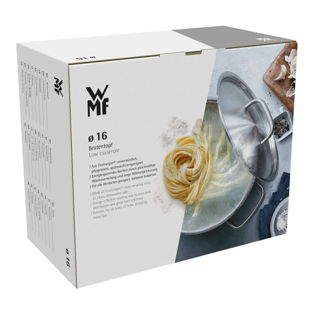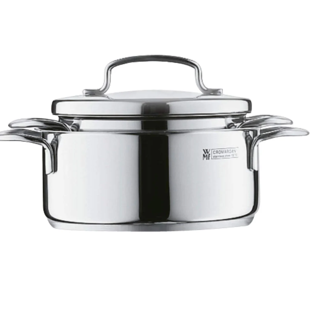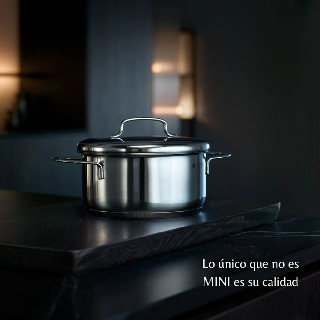 La Cacerola baja con tapa 16 cm Mini WMF, que tantas veces usarás como cazo con asas, es una pieza elegante, presentada en pequeño formato, con la que cocinarás con comodidad y eficiencia. Con un diseño compacto, pensado para ahorrar espacio, esta cazuela es ideal para todo tipo de cocinas y de recetas. Su capacidad de 1,5 litros es perfecta para cocinar los platos de diario, ya sea para tus guisos de legumbres, cremas de verduras, estofados de carne o recetas de pasta.