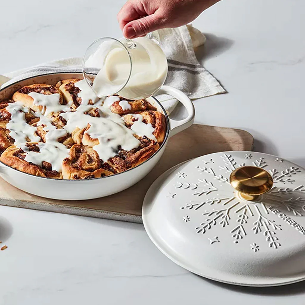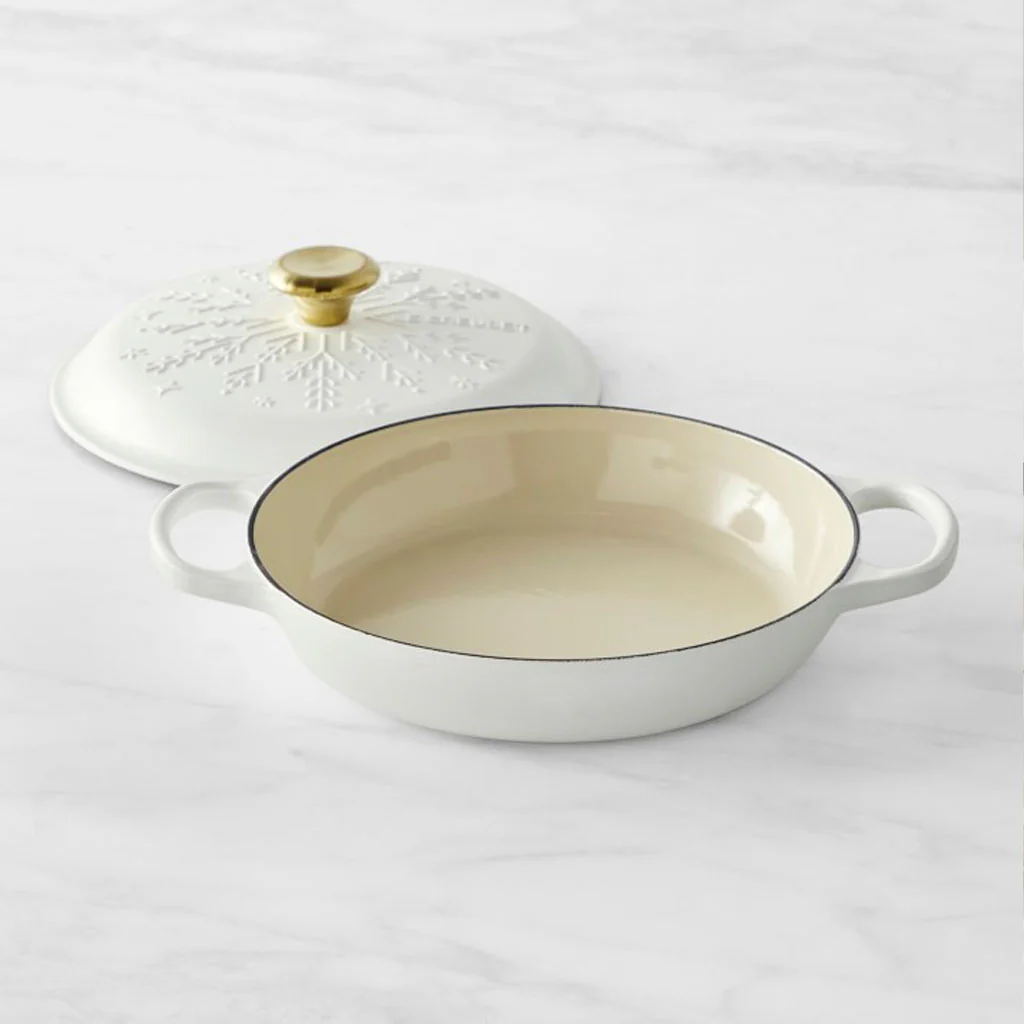 Hecha con la reconocida artesanía en hierro fundido esmaltado de Le Creuset, esta cacerola baja asegura que cada plato se cocine de manera uniforme y se mantenga caliente. La edición especial Noel viene en un elegante tono mate blanco que aporta un toque fresco y atemporal a tu cocina.