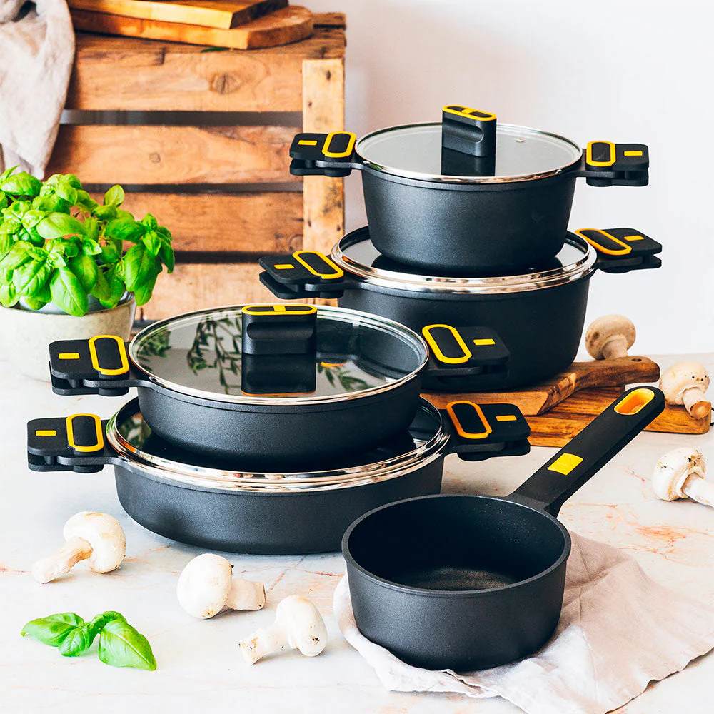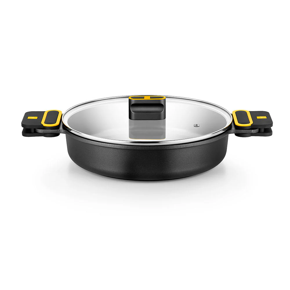 - Incluye dos asas de silicona negras con detalles amarillos termoaislantes y tapa de cristal.