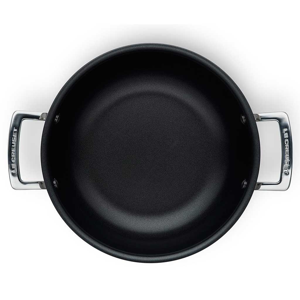 La Cacerola antiadherente del Chef Le Creuset es una cazuela con tapa, con forma redonda y laterales inclinados, que combina a la perfección su exterior de acero inoxidable de gran calidad, que ayuda a un control rapidísimo y elevado de la temperatura, con un interior antiadherente extraordinario.