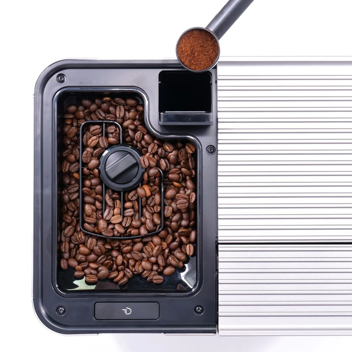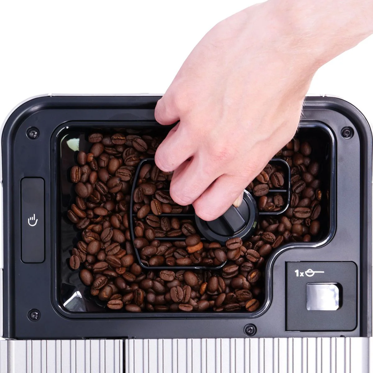 - Tolva extraíble para el café en grano, con capacidad para 270 g de café. ¿Te apetece probar una nueva variedad de café? ¿Quieres experimentar con el tipo de tueste? Solo tienes que girar y levantar la tolva para retirarla, vaciarla y volver a llenarla con granos de café. Con la tolva llena podrás preparar hasta 22 tazas de espresso.
