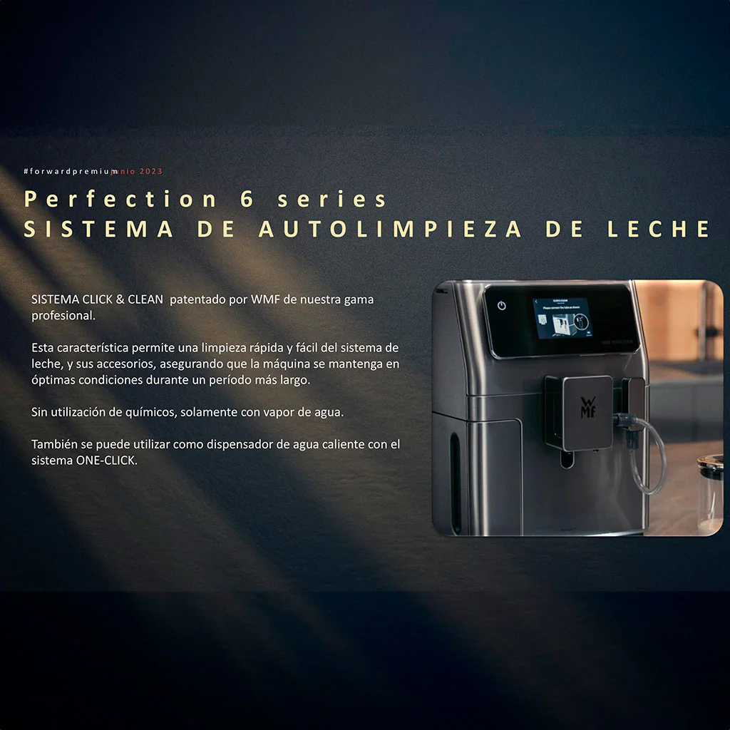 • Fácil limpieza. Sistema patentado de autolimpieza WMF Click & Clean para limpieza sin agentes químicos. La cafetera se mantiene en óptimas condiciones de forma rápida y sencilla, sin alterar la calidad del café.