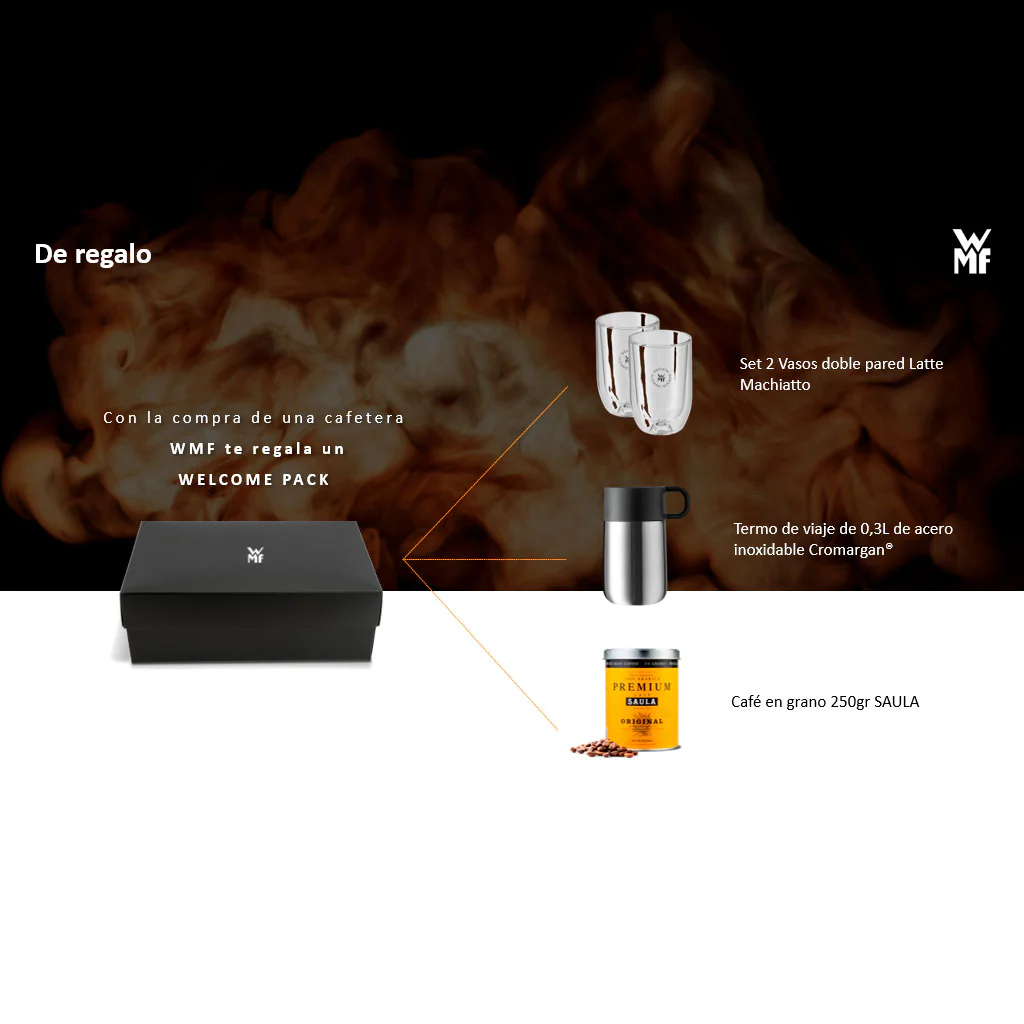 Además, la cafetera Full Auto Perfection 840 WMF viene acompañada de un fantástico regalo, el Welcome Pack (Pack de bienvenida). El pack está presentado en una elegante caja negra e incluye todo lo que necesitas para saborear el mejor café en cualquier parte: