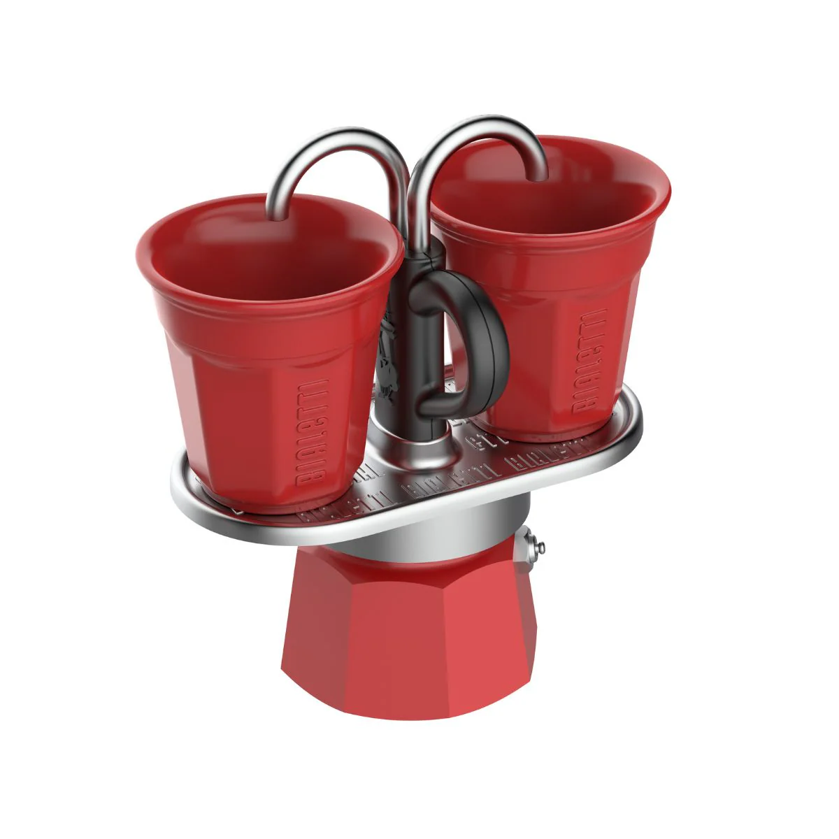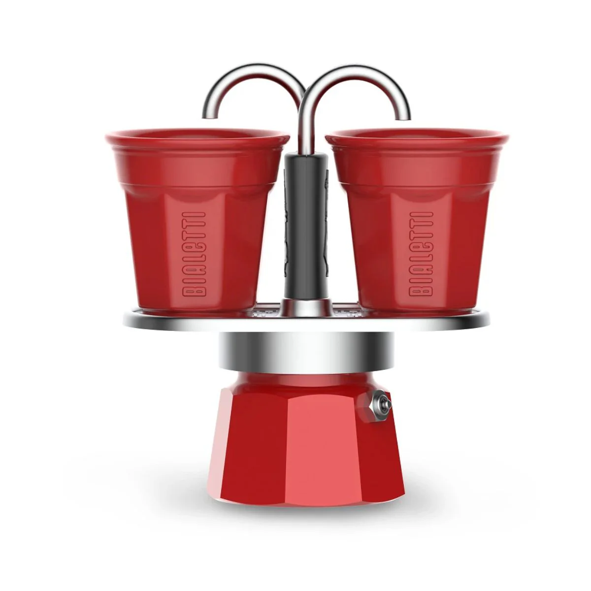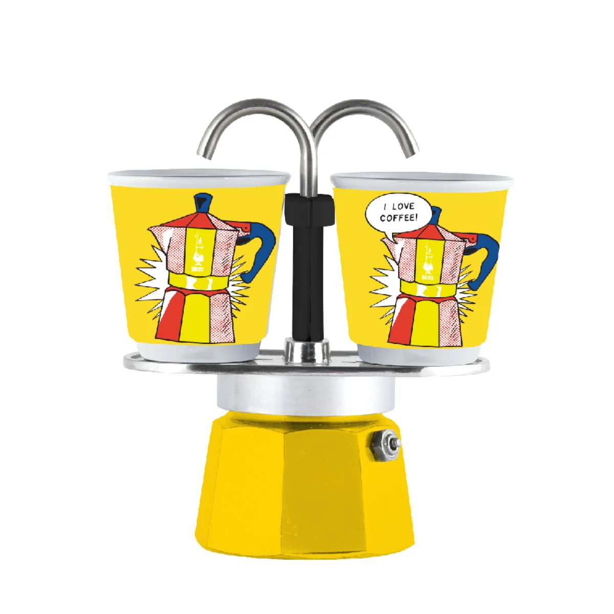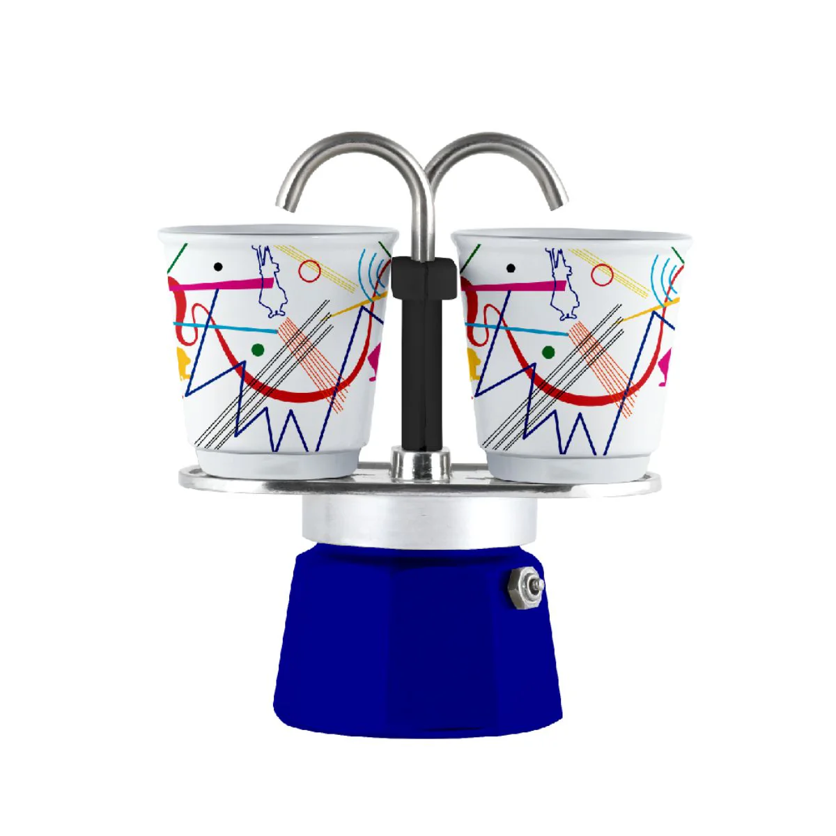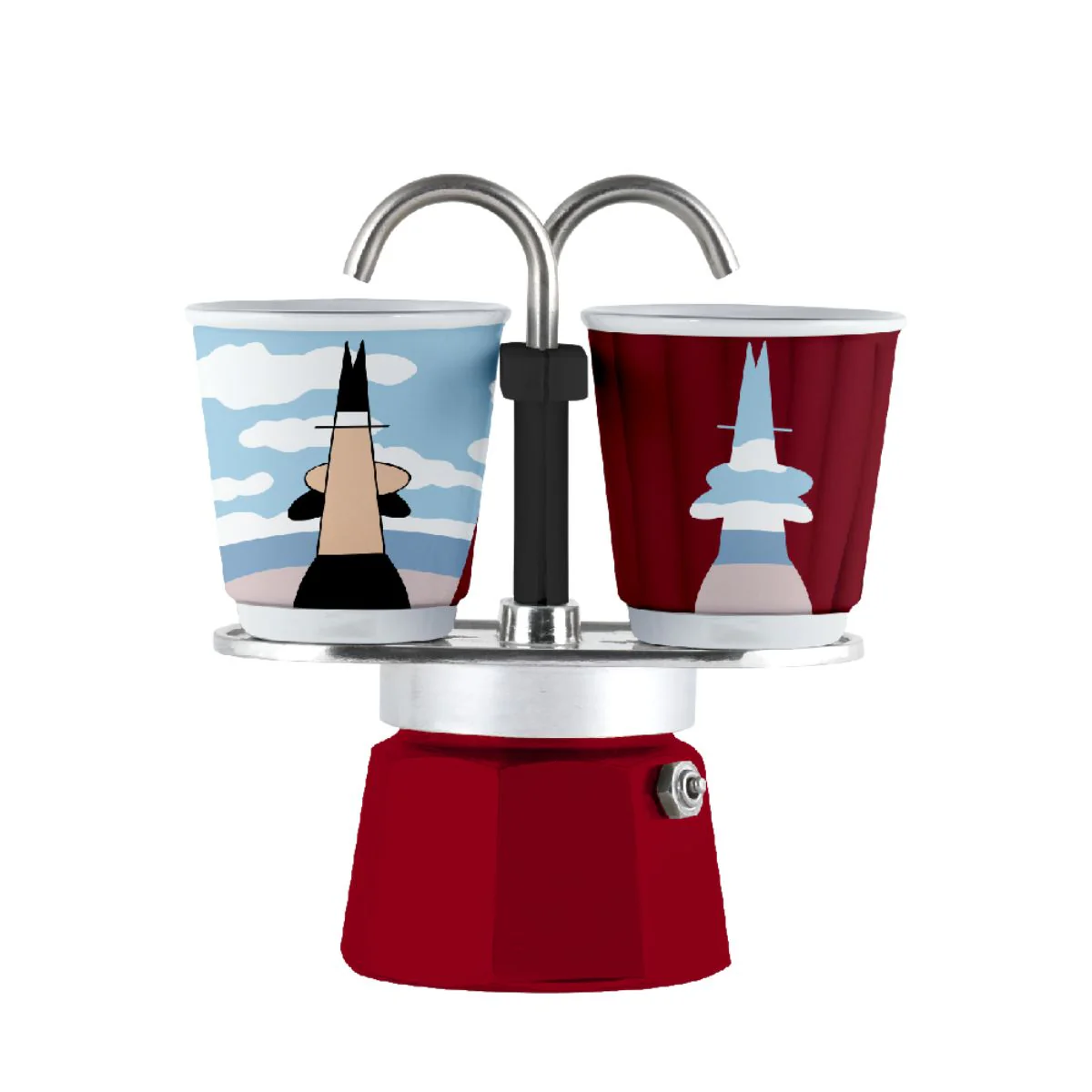 La cafetera italiana Mini Express Bialetti está disponible en diferentes formatos. Puedes elegir la cafetera con la caldera negra sin tazas, para aprovechar aquellas tazas de espresso que ya tienes en casa; el modelo de cafetera y tazas rojas, el modelo amarillo con diseño Liechtenstein en las tazas, el modelo rojo con diseño Magritte en las tazas, el modelo azul con diseño Kandinsky en las tazas o el plateado con tazas negras.