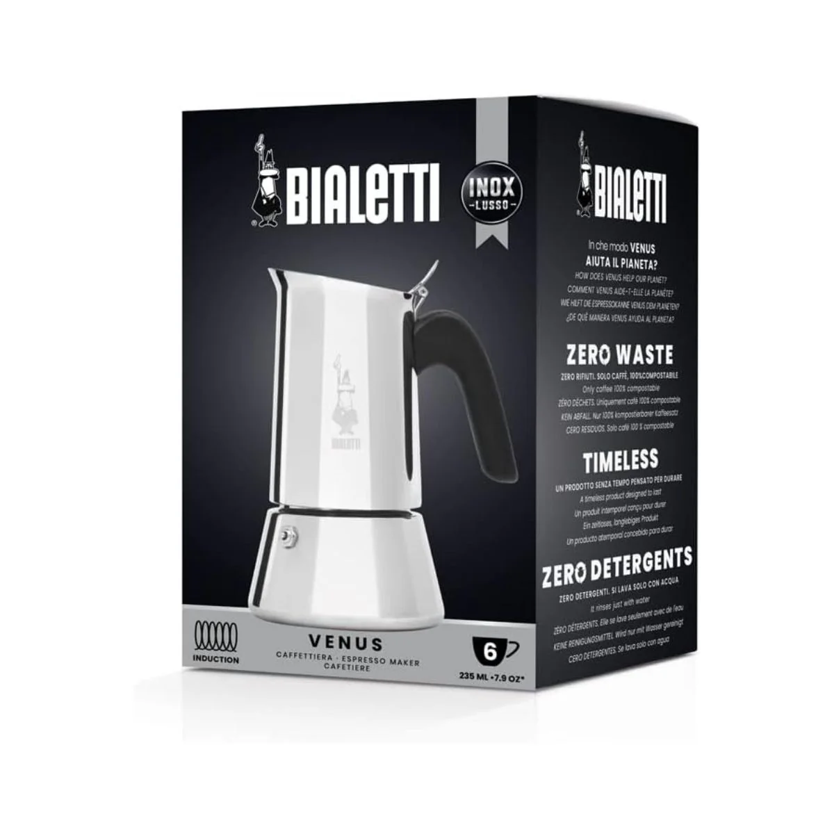 Está fabricada en acero inoxidable 18/10 de la mejor calidad y cuenta con una asa fabricada con materiales termoplásticos para evitar quemaduras inoportunas mientras se utiliza. Otra característica de la cafetera italiana Venus Bialetti que merece la pena destacar es que es compatible con cocinas eléctricas, de gas e incluso de inducción (excepto la de 2 tazas de capacidad que no puede utilizarse en inducción).