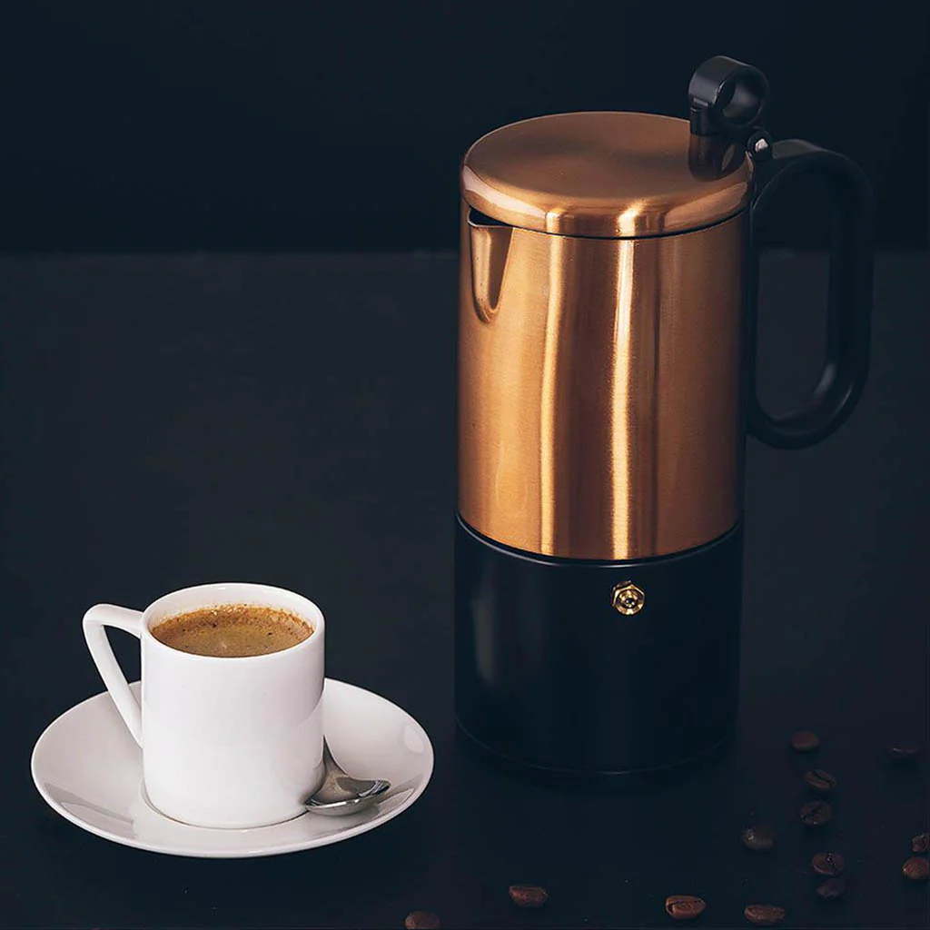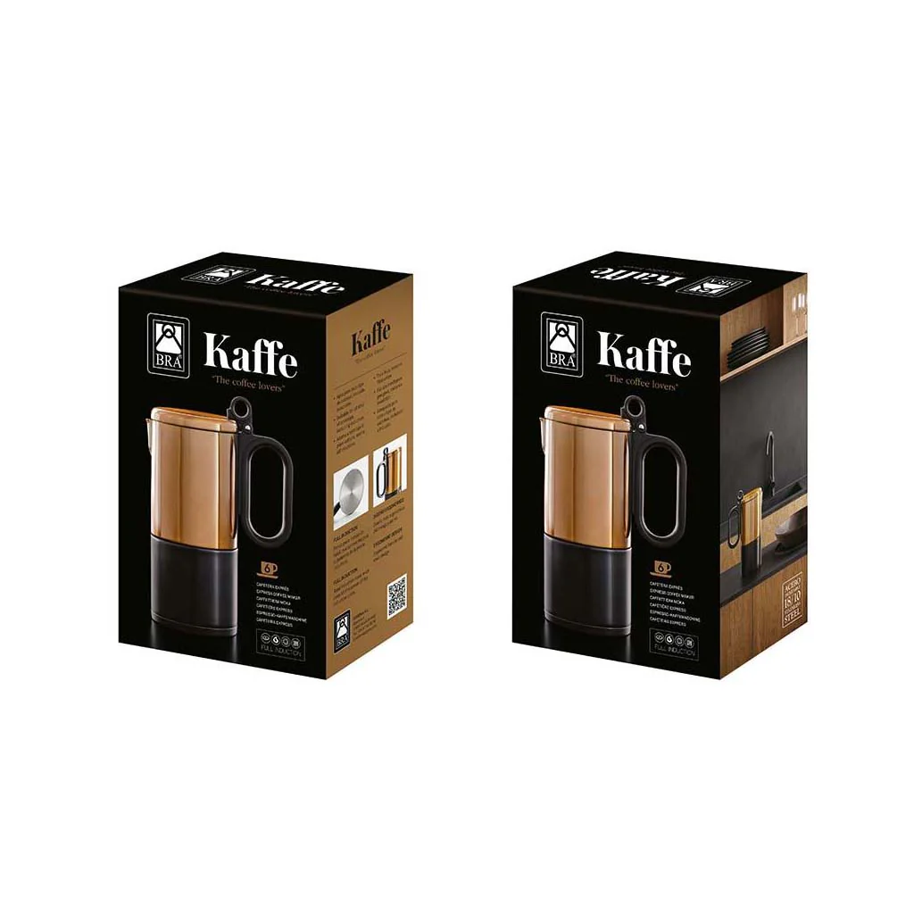 Déjate sorprender por la Cafetera Kaffe de Bra. Fabricada en acero inoxidable, la cafetera italiana clásica se viste de dorado y negro con un diseño de lo más elegante, conservando la auténtica esencia del café que inundará con su aroma toda tu casa.