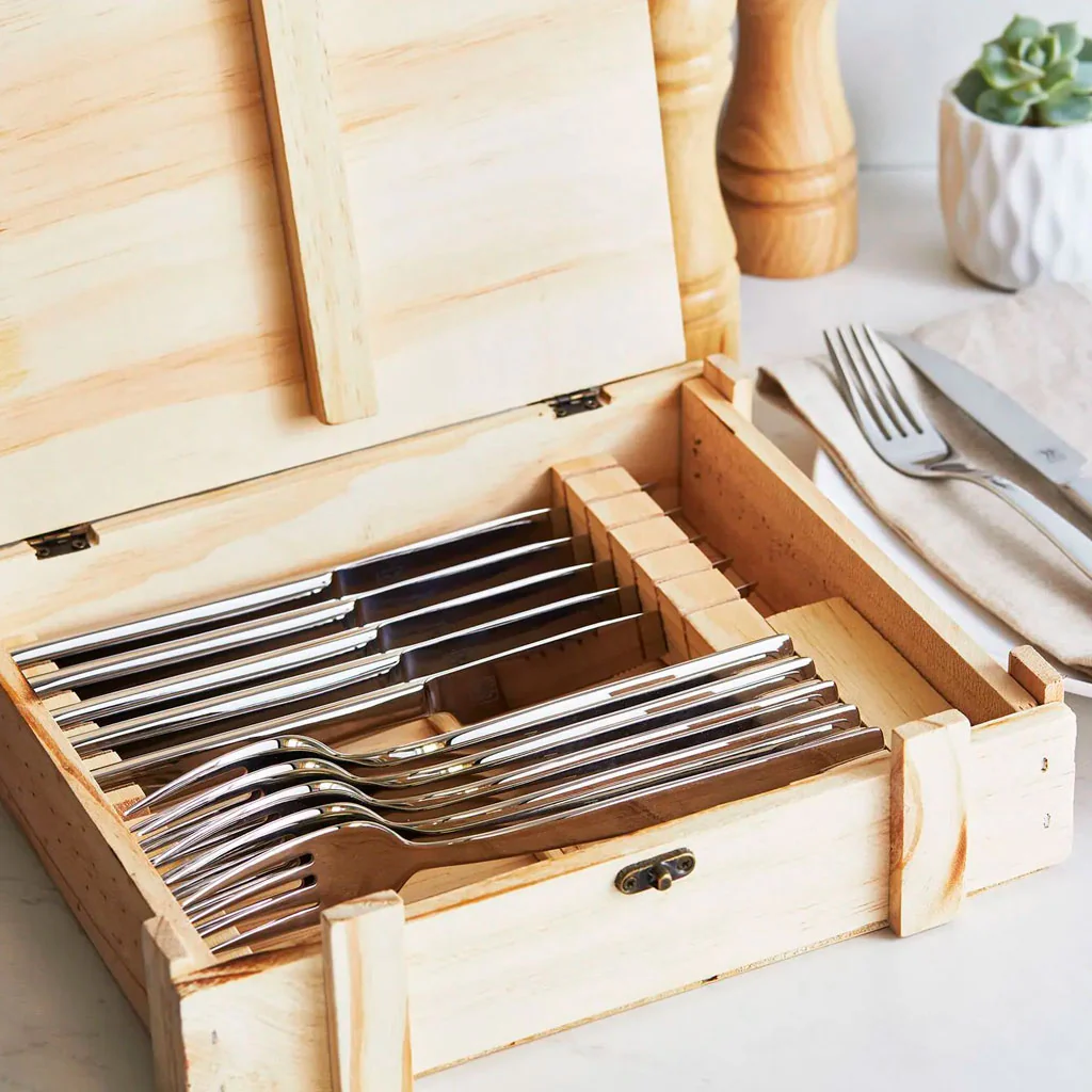 Al ir presentado en una bonita caja de madera natural y un look de estilo cowboy, es un set ideal para regalar a los amantes de la carne o de las barbacoas, y a todos los que requieren completar su cubertería con piezas de calidad.