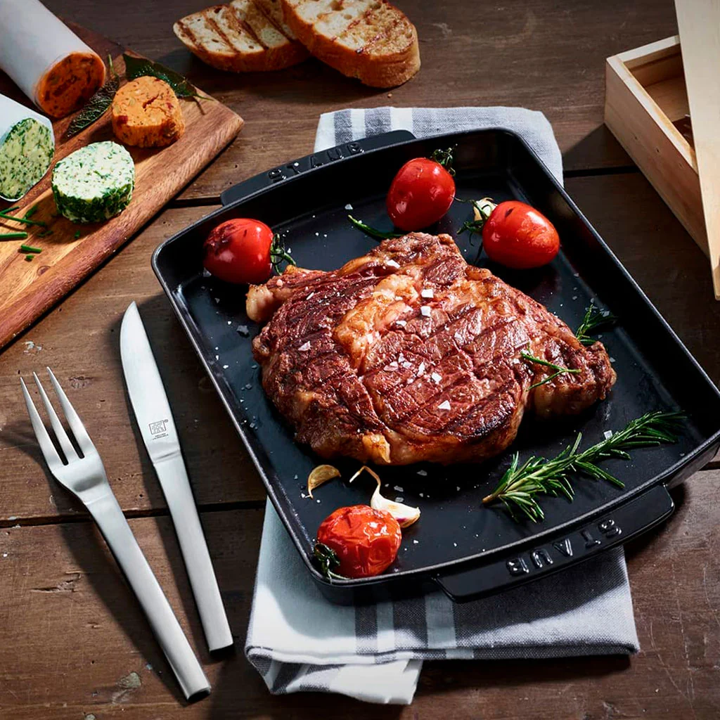 El conjunto Steak está compuesto por 12 piezas, que incluyen 6 tenedores y 6 cuchillos de hoja dentada de acero inoxidable, con los que no habrá pieza que se resista.